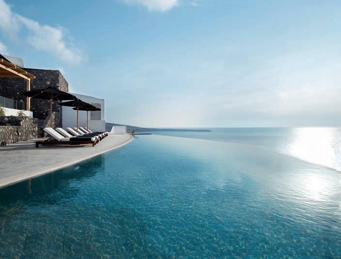 people, ideal for families, friends and couples. Finally, the unique and exclusive Royal Suite is actually a 140 square me- ters private villa in the hotel, with a large heated jacuzzi pool on the private balcony, rare and precious pieces of art and furniture for up to 6 people. All our suites are equipped with LCD Sat TVs 32” and 42” (or wider), desk, bluetooth speakers, tablet PCs, free wifi connec tion, telephone, laptop size safe box, mini-bar, ironing facilities, hairdryers, scales, beauty mirrors, fine Guy Laroche linens, towels and bathrobes for every guest, slippers, luxury Hermes or Guer lain cosmetics, pool towels and much more. The large infinity heated swimming pool on the cliff offers a unique experience swimming and enjoying all the view from Oia to Akrotiri, a pool to infinity with a bar in the water open all day until the sunset hours. The room service offers an extended menu with a wide list of drinks and food. Drinks are available 24 hours and our kitchen is open from 11:30 ‘till midnight. The Esperisma Bar-Re staurant which is located in the hotel’s upper balcony is open all day offering the most refreshing signature cocktails, serving some carefully selected dishes combined with a list of fine wines and champagnes especially during the sunset ‘till the late hours.