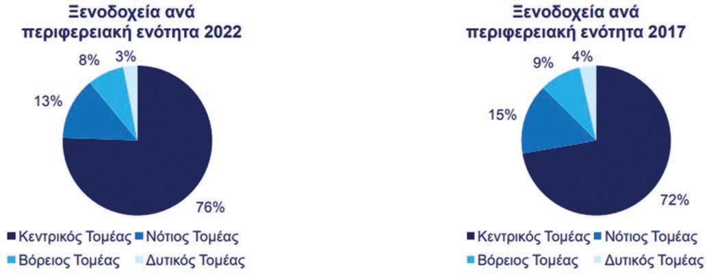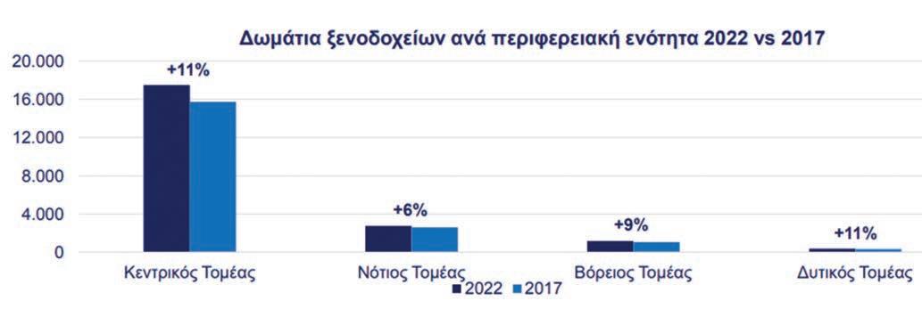 • Το 2021, οι αφίξεις στο λιµάνι του Πειραιά έφτασαν στο 66% των επιπέδων του 2019, βάσει στοιχείων του ΙΝΣΕΤΕ. • Σύµφωνα µε τα στοιχεία της GBR Consulting, το 2022, τα ξενοδοχεία της Αθήνας, στην οποία περιλαµβάνονται οι Π.Ε. του Κεντρικού, του Νότιου, του Βόρειου και του ∆υτικού Τοµέα Αθηνών, αυξήθηκαν κατά 17%, ενώ τα δωµάτια ξενοδοχείων αυξήθηκαν κατά 10%, σε σύγκριση µε το 2017.