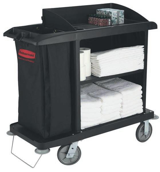 Rubbermaid Housekeeping Carts, Τρόλεϊ καμαριέρας Τροχήλατο τρόλεϊ καµαριέρας, σε µαύρο χρώµα, µε 3 ράφια και πλαϊνό σάκο από ανθεκτικό νάυλον υλικό, εύκολο στον καθαρισµό του (συµφωνεί µε τα πρότυπα του HACCP). *περιλαµβάνει 1 σάκο* ∆ιατίθεται σε 2 διαστάσεις: Μεσαίου Μεγέθους ∆ιαστ. 124,5x55,9x127cm - κωδ. FG619000 Μεγάλου Μεγέθους ∆ιαστ. 152,4x55,9x127cm - κωδ. FG618900 Mπορεί να συνδυαστεί µε επιπλεόν αξεσουάρ, για την κάλυψη διαφόρων αναγκών: - Ντουλάπι που κλειδώνει για την επιφάνεια του τρόλεϊ - Σετ από 2 πόρτες που κλειδώνουν - Συρτάρι βάθους 7,5cm, µε κλειδαρία Ράφι αποθήκευσης για κάτω από το τρόλεϊ διαστ. 64,5 x 53 17 cm. Για περισσότερες πληροφορίες: www.equiphotel.gr