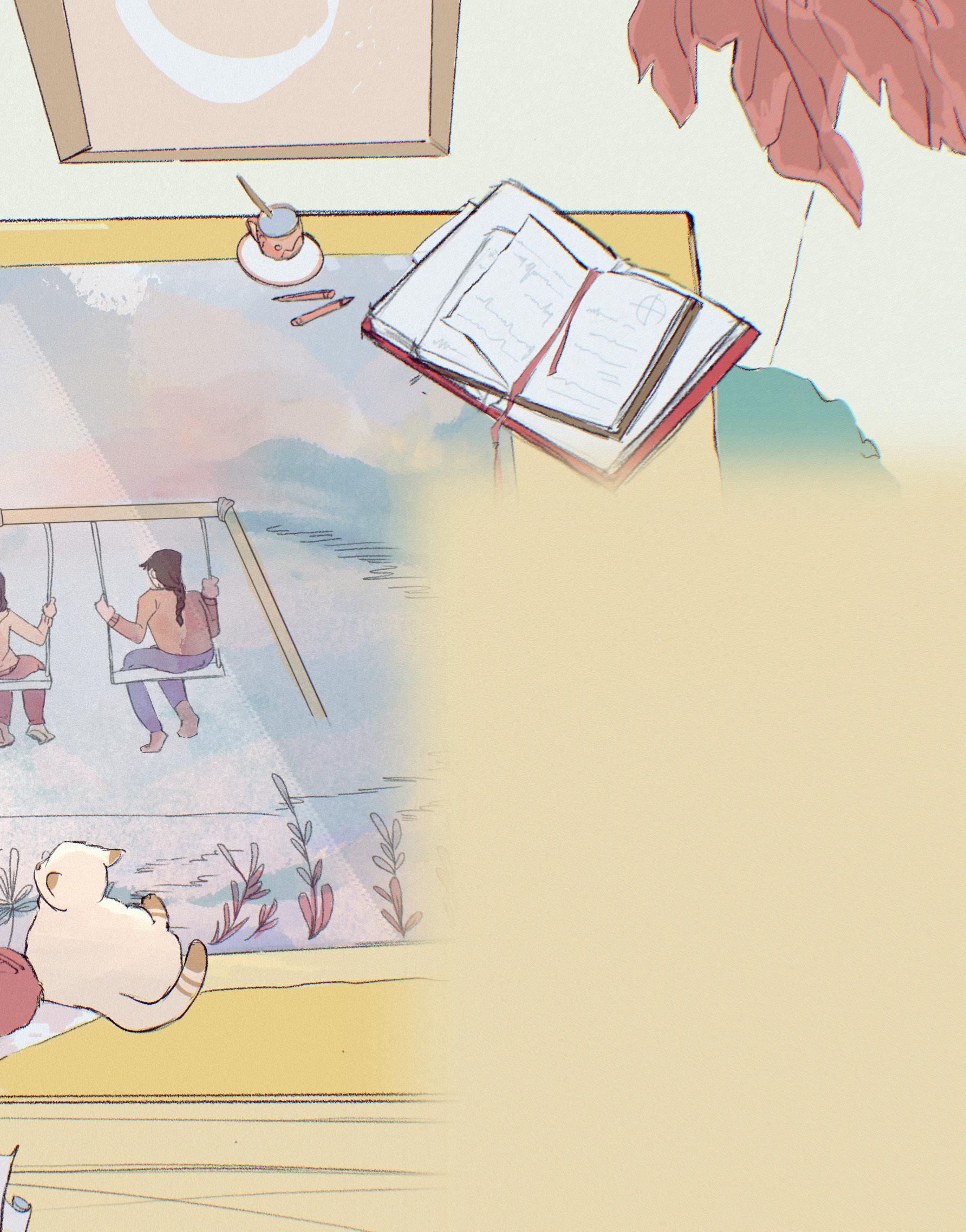 The dancing daisies tell me in glee, swaying with the flow of the wind. So I reach out for my companion and push ahead, our fingers intertwined. At the edge of the field is a pair of swings, old and rusty. I sit alongside the murky creature, the rough metal on my fingertips easing my soul. It was our favorite spot. The longer we stayed in place, the more the heat became unbearable.