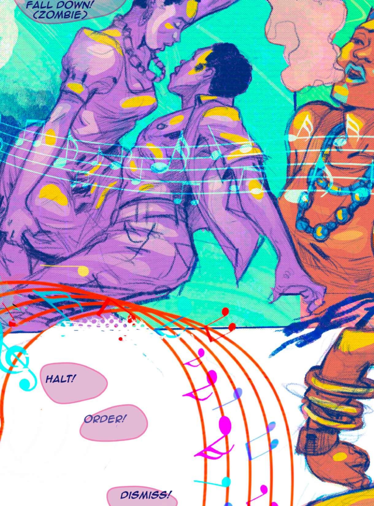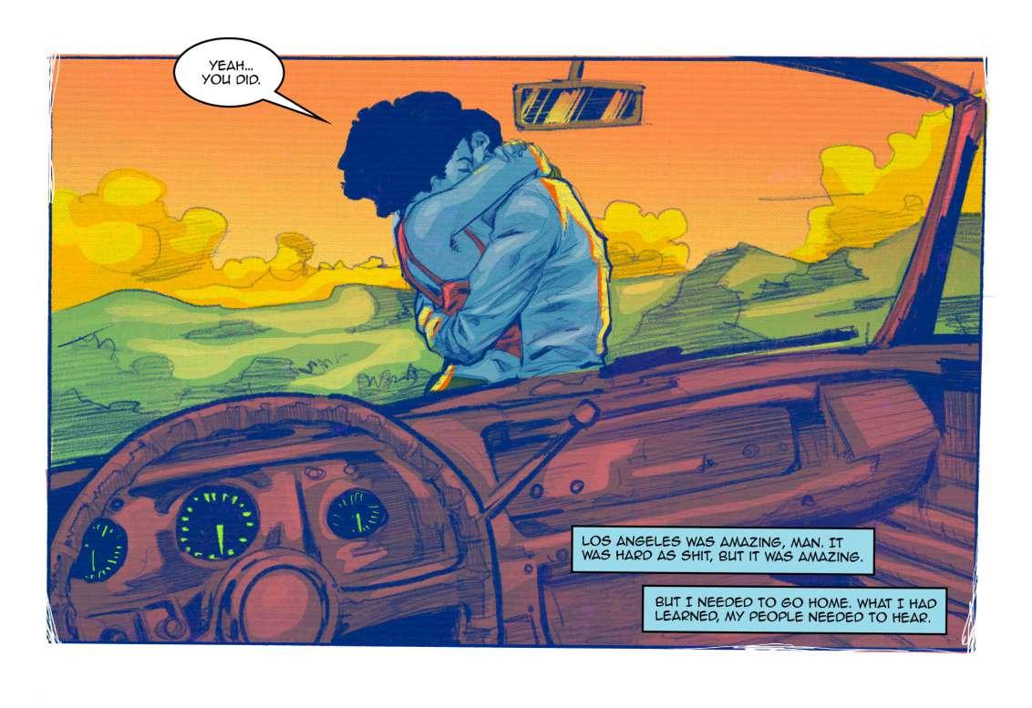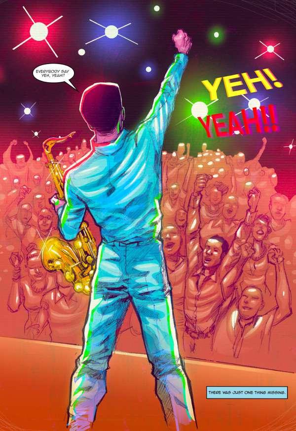 “If you look at the art direction of our story, it’s almost like the arc of Fela’s songs—they take you on a journey and we wanted the reader to experience that same sensation with this book,” Fagbamiye says, matching his art to the rhythms of an improvisational 30-minute Fela Kuti jam. “We were thinking about the book like a movie—in creating anything, it’s about how the reader is going to experience it. With this book, we wanted to get the reader to join us on a ride.”