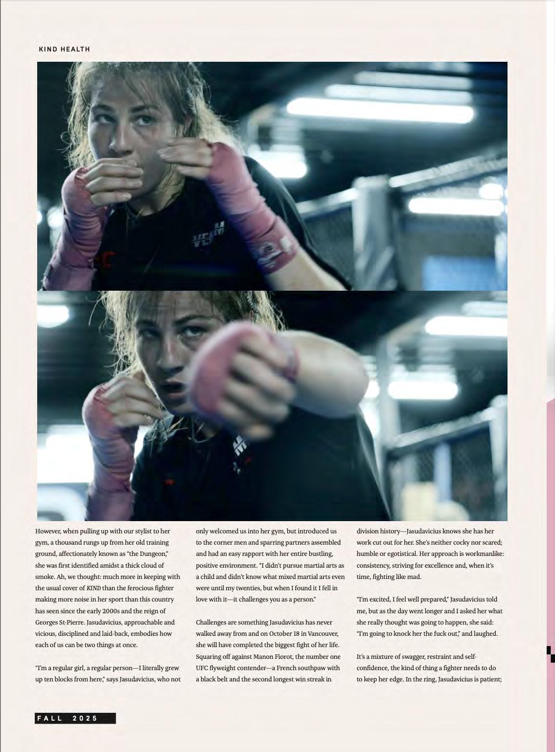 Jasudavicius will have fought Manon Fiorot by the time our issue has gone to press. For updates from the fight and words from Jasmine Jasudavicius, please see kindmagazine.ca.