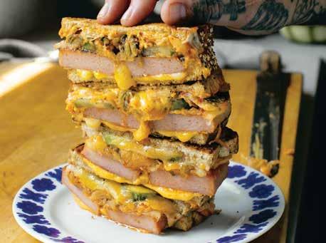 In the same pan you used to cook the Spam, put 2 slices of your bread, buttered- side down. Top one bread with 2 slices of the marbled cheddar and the other with 1 slice of the American cheese. Put 2 slices of Spam on the American cheese side, side by side, and kimchi on the marbled cheese side. Flip your Spam side onto the kimchi.