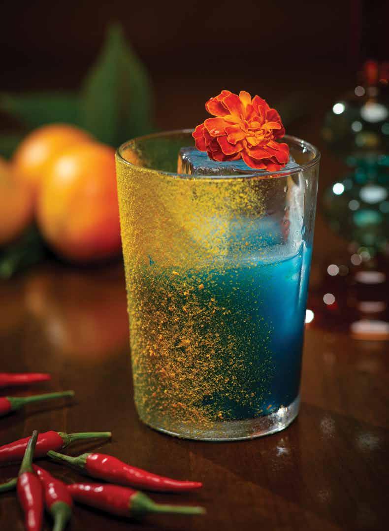 Blue Spirulina is a blue algae that offers numerous health benefits, such as anti inflammatory, anti oxidant and immune system enhancement. The glass is dusted using our housemade mango chili salt. This tropical, spicy beverage is infused using our new Dope Mocktail Qush Tube, 2.5mg THC & CBD per Qube.