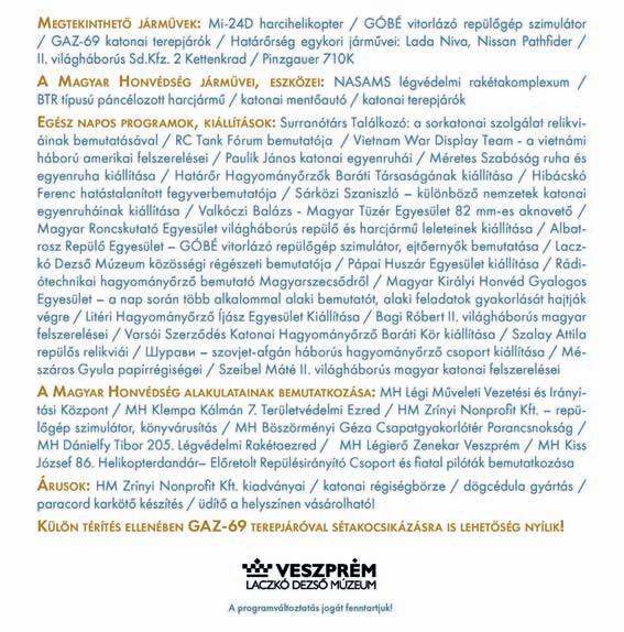 A vendégek különleges vadételeket kóstolhatnak, például vaddisznópörköltet vagy szarvas carpacciót. Helyi éttermek és food truckok kínálják a fogásokat. Emellett a balatoni borászatok kínálják boraikat kóstolásra. A rendezvényt élőzene és kulturális programok színesítik. Családi programokat is szerveznek: kézműveskedés, gyermekkoncertek és természetismereti játékok várják a kicsiket. A belépés ingyenes, de a kóstolók fizetősek. forrás: mindmegette.hu