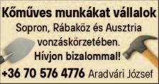 Kisebb-nagyobb kőművesmunkákat vállalunk! Mindenre garancia! Betonozás, tetőjavítás, kúpcserépkikenés, kémények feljavítása, bitumenes tetőszigetelés, térkövezés, földmunka, sírkőfelújítás Hétvégén is hívhat: +36-70/218-3343