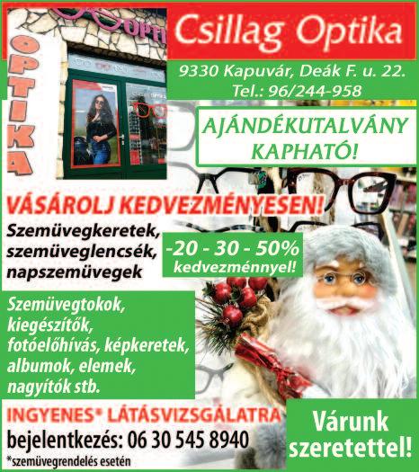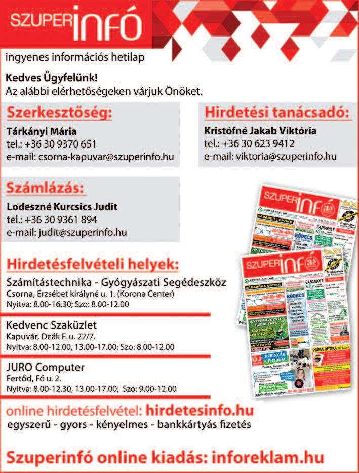 Kiadó: INFOREKLÁM Kft 9300 Csorna, Kismar toni u 2/a; telefon: +36 30 9370 651 Felelős kiadó, szerkesztő: Tárk ányi Mária ügyvezető Sokszorosítás: Comorn Lapmanager, Kiadó és Kereskedelmi Kft. terjesztés: Hírlap Post 2020 Kft Szerkesztőség: 9300 Csorna, Kismar toni u. 2/a tel: +36 309370 651, e -mail: csorna-kapuvar@szuperinfo.hu