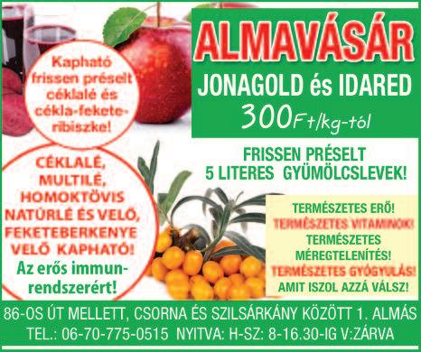 Őstermelőnél alma eladó több faj tából. Csorna, József Attila u. 66. Tel.: 96/262 220; 30/297 5477