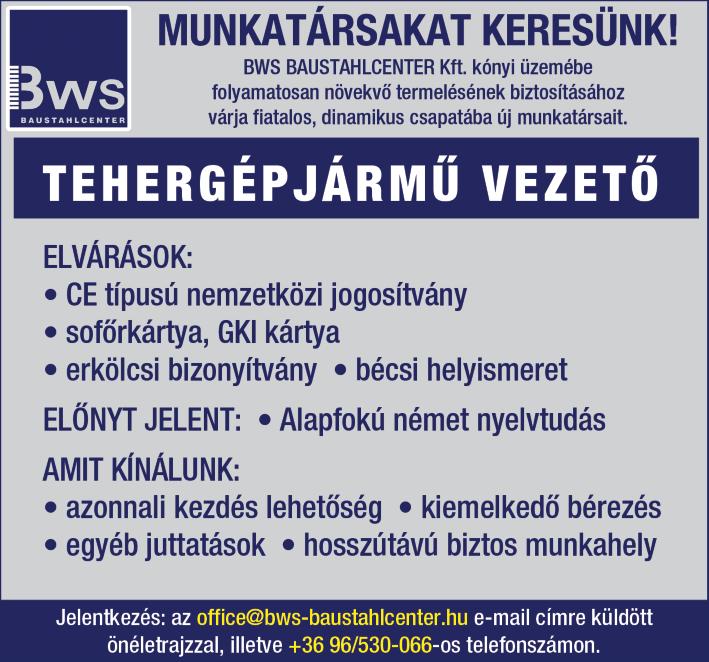 Csornai székhelyű vállalkozásunkba hosszútávra keresünk 4 tengelyes billencs tgk ra gyakorlattal rendelkező, önálló munkavégzésre képes, munkájára igényes gépjár művezetőket Érd: +36 30 530 21 99 ATL Transport Kft Mindenszenteki koszorúk készítéséhez munkatársakat keresek Fertődre 06 30/830 6494 Lőrincz Gábor