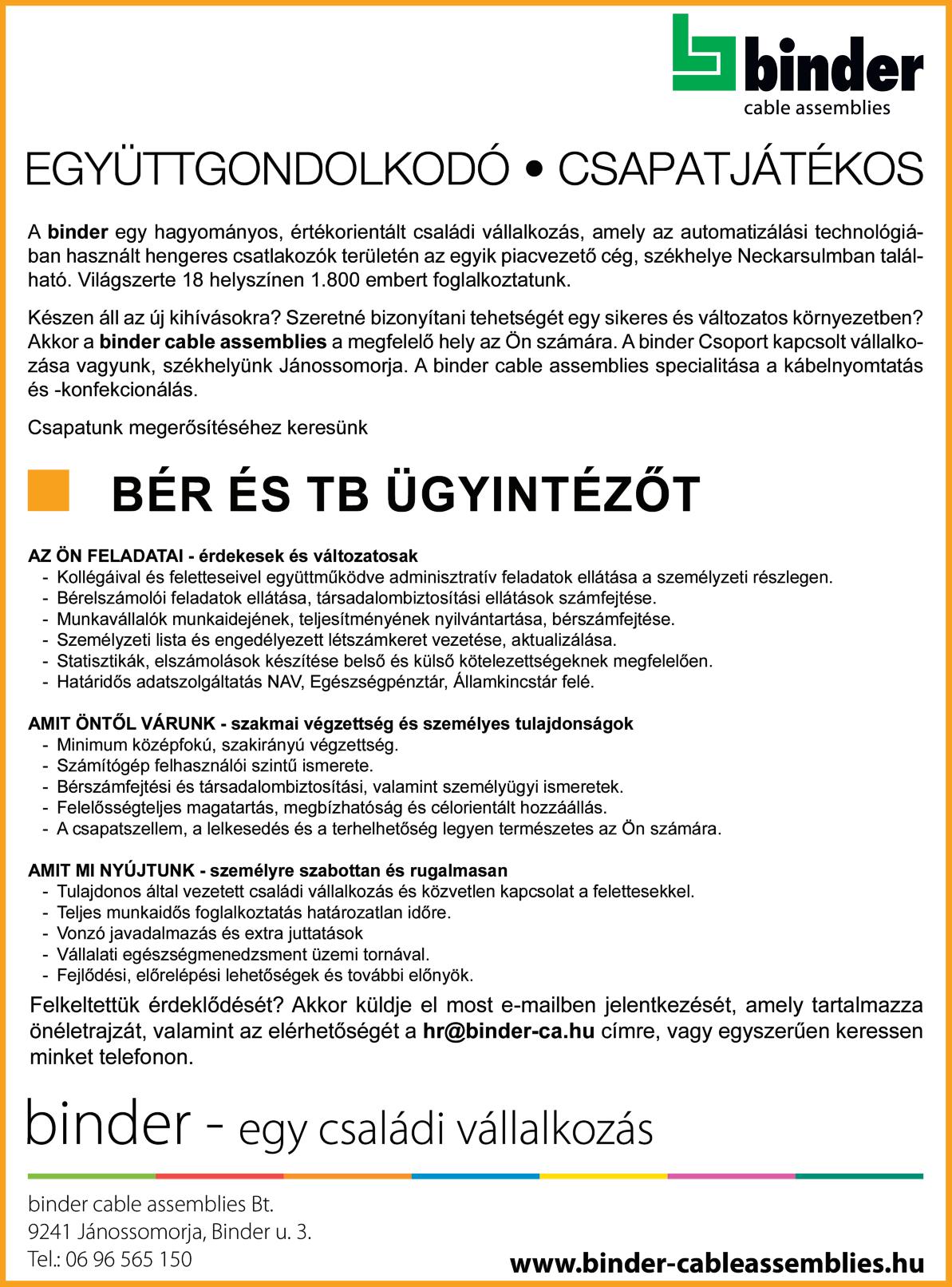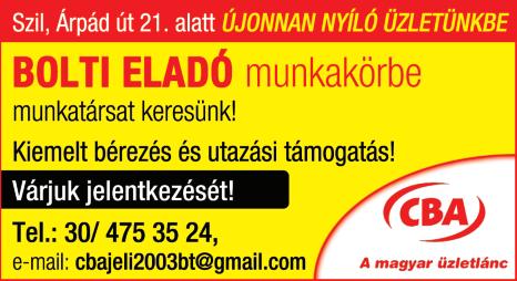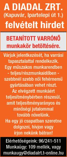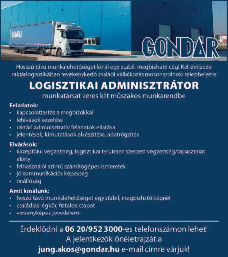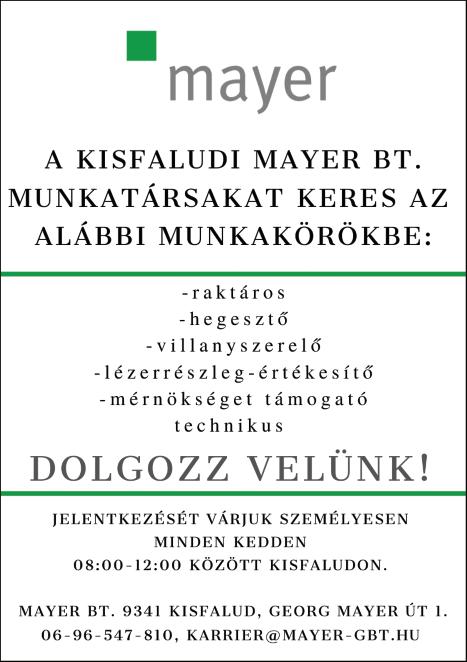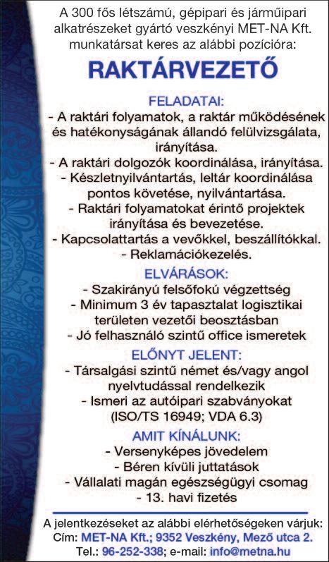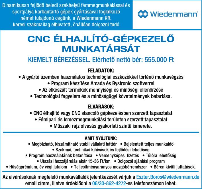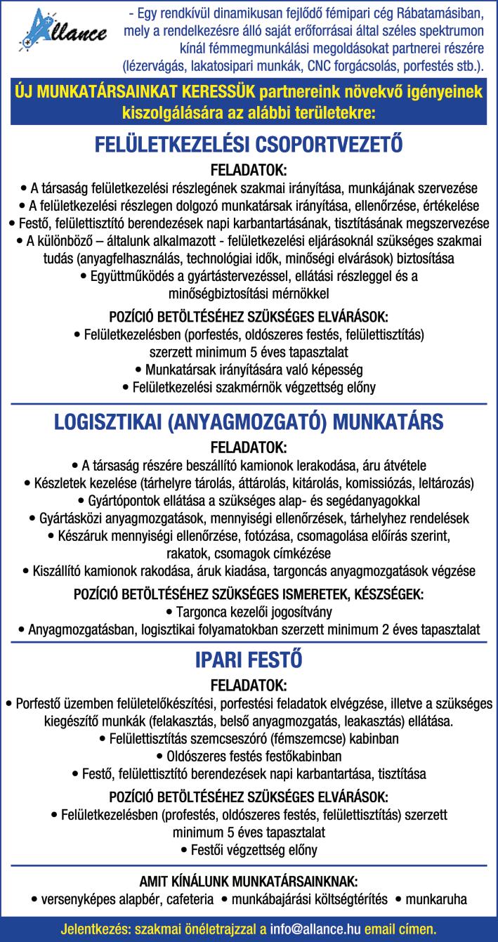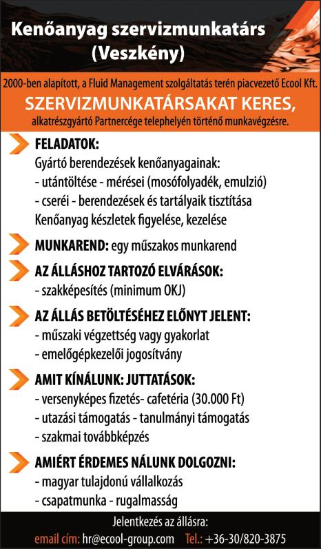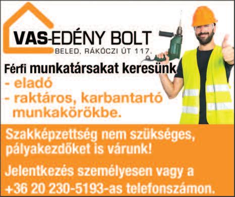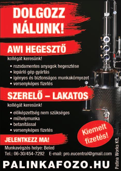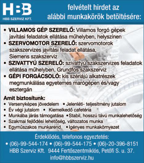 Bödecs Szerelvény Áruház eladó munkatársat keres Érd : 06 30/248 0529 Kapuvár MIHÁLYI AGRÁR Zrt Gyóró tehenészeti telepre kollégákat keres fejő, és felhajtó munkakörbe Érdeklődni munkaidőben: 0620 331 1245 Cnc gépkezelő munkalehetőség Sárváron nettó 2200 Ft/óradíj 3 műszakos munkarend, azonnali kezdés Betanított cnc gépkezelő 1800 Ft/óradíj (feltétel: mérőműszerek is merete, előny: cnc gépen szerzett tapasztalat) Co2 hegesztő, szer számkészítő szakképesítéssel nettó 2200 Ft/óradíj Utazási támogatást biz tosítunk Extrackt Pro Kft, femmunkak22@gmail com, +36 70 599 2857