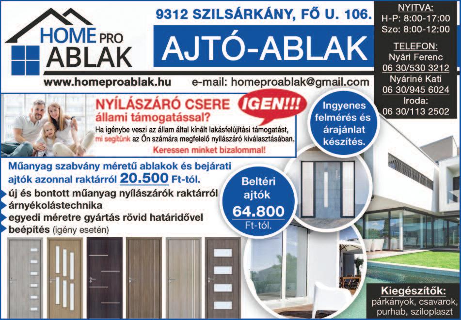 Üveges, fa bejárati ajtók hőszigetelt üveggel, záró gumitömítéssel, kilin ccsel, kulcsokkal, 98*208 as méret (egyszárnyas kivitel) 109 900 Ft/db, valamint 138*208 as (kétszárnyas kivitel) 149.900 Ft/db. Munkaidőben: 0 6 3 0 / 6 1 0 3 8 5 0 www rbfnyilaszarokft hu, Bősárkány, Almáskert u 1 Új, építkezésből megmaradt és bon tott nyílászárók nagy választékban 600 db os raktárkészletről azonnal vihetők! www hasznaltablak hu