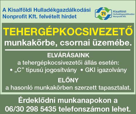 Csornai székhelyű vállalkozásunkba hosszútávra keresünk 4 tengelyes billencs tgk ra gyakorlattal rendelkező, önálló munkavégzésre képes, munkájára igényes gépjár művezetőket Érd: +36 30 530 21 99 ATL Transport Kft.