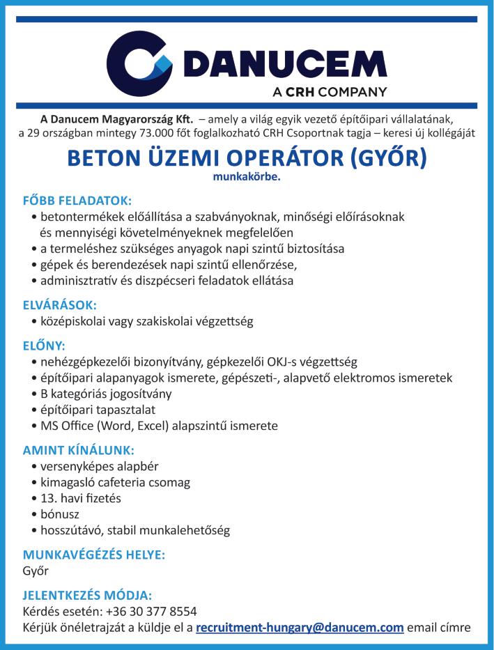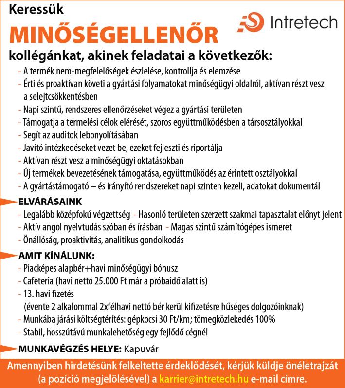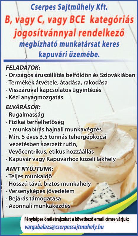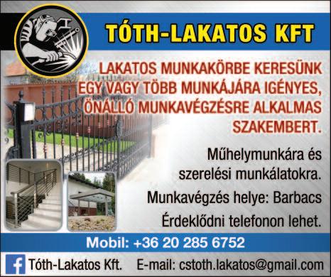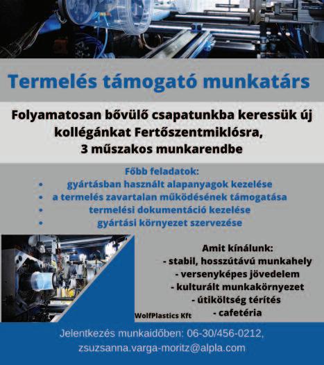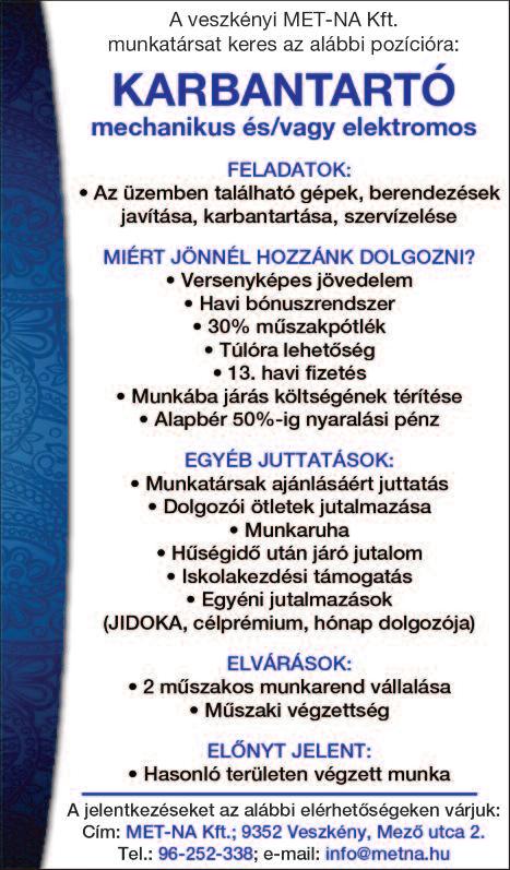 Kapuvári fűrészüzembe keresünk önállóan dolgozni tudó, fémipari tapasztalattal rendelkező, élezésben, lakatos munkákban jártas TMK-s karbantartót 1 műszakos munkarend, jó kereseti lehetőség Időpont egyeztetés hétfőtől péntekig 8-16 óra között: 06-70/625-0444 Barcs Trans Kft