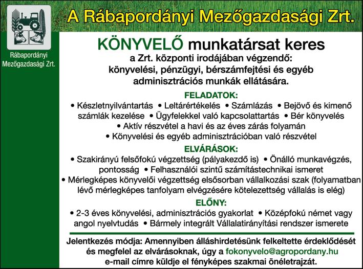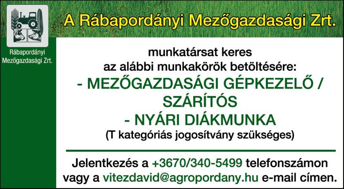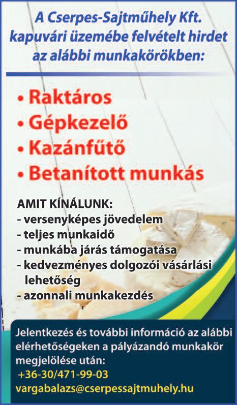 Fertődi Pénzintézetbe takarító munkatársat keresünk Napi 1 órás délutáni munkavégzés keretében 06-30/419-8414 Horváth István Bősárkányi raklapgyártó üzembe egy női munkaerőt könnyű munkára, tuskó besütéshez, heti 2-3 nap(lehet nyugdíjas is) és egy férfi alkalmazottat keresek, szegező gép mellé! Folyamatos,vagy alkalmi megoldás is szóba jöhet! Fizetés megegyezés szerint! Jelentkezni előzetes egyeztetés alapján a 06-30/ 9736493 telefonon lehet! Kiserdei sertéstelep Kónyban sertésgondozót keres Érd: hétfőtől-péntekig 8-12 óra között a telepen, vagy 06-30/3017-127 Kóny-Pig Kft