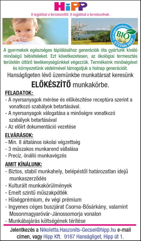 Bősárkányi raklapgyártó üzembe egy női munkaerőt könnyű munkára, tuskó besütéshez,heti 2-3 nap (lehet nyugdíjas is) és egy férfi alkalmazottat keresek, szegező gép mellé! Folyamatos, vagy alkalmi megoldás is szóba jöhet! Fizetés megegyezés szerint! Jelentkezni előzetes egyeztetés alapján a 06 30/ 9736493 telefonon lehet! Árubeszerzésre keresek munkatársat, heti 1-2 alkalomra, kónyi telephelyre Követelmény: B kategóriás jogosítvány Jelentkezés: 30/492-5230 Győr-Szeszico BT