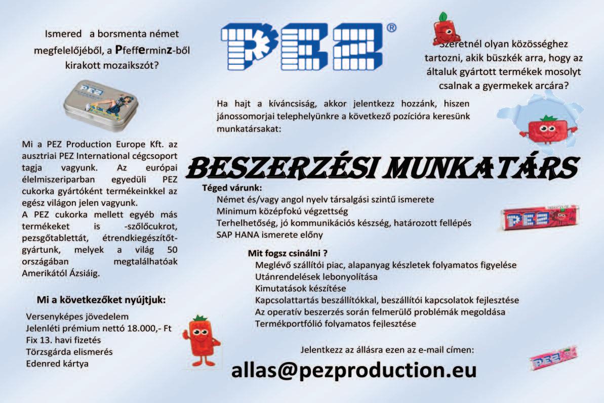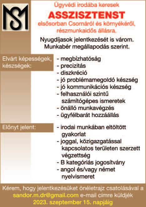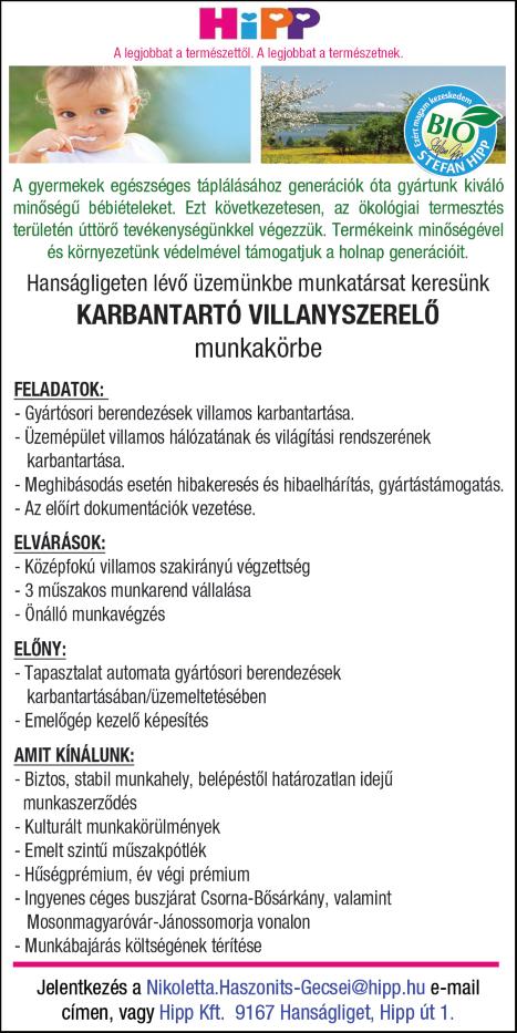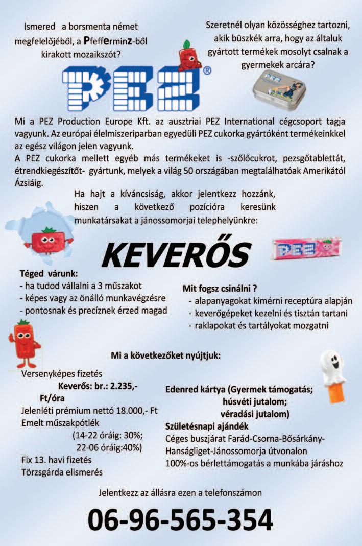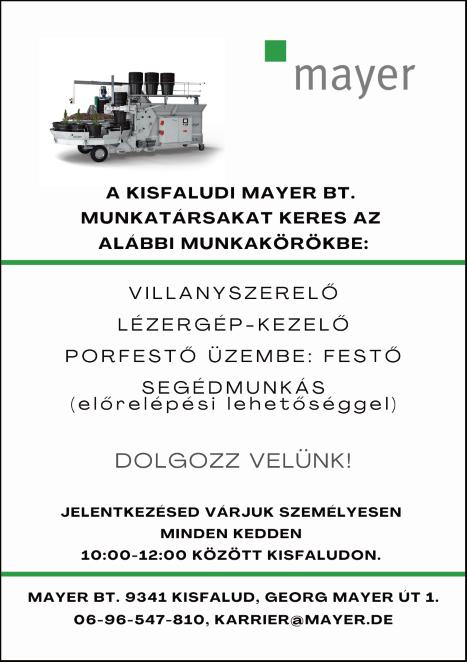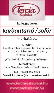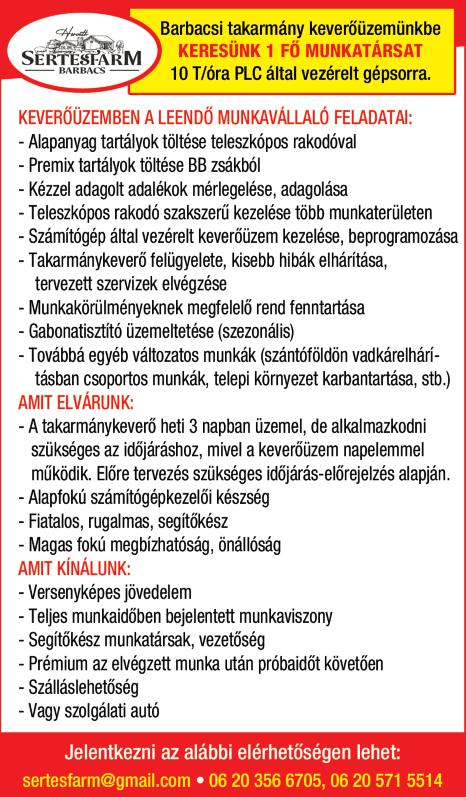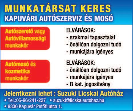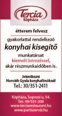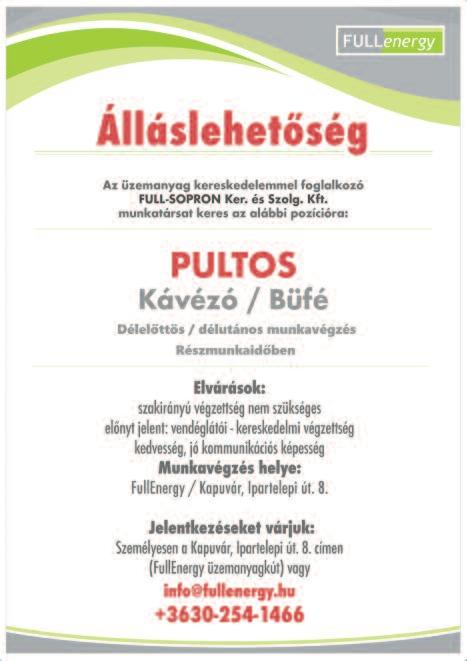 Munkatársat keresek állatok gondozására, napi 2-3 órára Kónyba Tel: 30/469-8323 Farkas Zoltán Gyorséttermi büfébe tapasztalattal rendelkező, megbízható, talpraesett, kommunikatív munkatársat keresünk. Roni falatozó Kapuvár 0670/933-2219