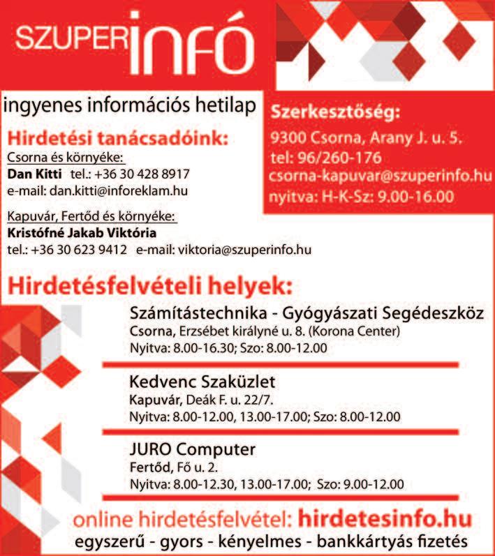 e -mail: csorna-kapuvar@szuperinfo hu, web: inforeklam hu, szuperinfo hu, Sokszorosítás: Comorn Kft - Terjesztés: Hírlap Post 2020 Kft