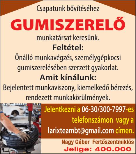 Autóbuszvezető kollégát keresünk Kapuvár-Csorna-Beled környékéről Teljes illetve részmunkaidősre is 06309895896 Kiss Roland Soprontól 20-km-re egy ausztriai, családias étterem keres németül beszélő konyhai kisegítőt éves állásra; ételkiszállítót heti 20 órára (912 óra között); illetve takarítónőt heti 1 alkalomra, azonnali kezdéssel Szállás nincs, autó szükséges! Munkavégzés helye: Landgasthaus zum Bären, Zillingdorf Bergwerk Tel : +43-262/452-355 (Willhelm Fürlinger)