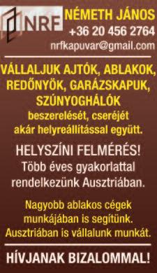Új, építkezésből megmaradt és bontott nyílászárók nagy választékban 600 db-os raktárkészletről azonnal vihetők! www hasznaltablak hu Étkezőgarnitúra eladó tömör fából, közvetlenül a gyártótól Asztal + 6 kárpitos szék 99 900 Ft, színválasztékkal, raktárkészletről elvihető. 06-30/639-1574 www szaszabutor com Garázskapu, bukó rendszerű, fehér színben, 1 év garanciával: 240x200as, 240x210-es és 250x200-as méretben 159 900 Ft/db, 260x210es méretben 179 900 Ft/db, 260x225-ös méretben 189 900 Ft/db 06/30/610-3850 www rbfnyilaszarokft hu , Bősárkány, Almáskert u 1
