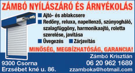 TUTIPUR! Szórt purhab hőszigetelés hőhíd nélkül tetőszerkezet-födémaljzat-lapostető-tartály-siló, gazdasági épületek, könnyűszerkezetes házak, medence szigetelése Hő, hang és vízálló! Gyors és környezetbarát! Akár 70 %-os rezsicsökkenés! Érd : 06 30 226 4185 Redőnyök, reluxák, szalagfüggönyök, napellenzők, szúnyoghálók, harmonika ajtók, párkányok, zsaluziák stb, kedvezménnyel, garanciával, rövid szállítási határidővel 2001 óta a Megyében! Ingyenes kiszállás, árajánlat Tel: 06 30 235-0927 Horváth Attila www redonyosattila hu Varga kárpittisztítás! Ülőgarnitúrák, kanapék, fotelok, székek, matracok, autókárpit, szőnyegek tisztítása 0630/9869-672