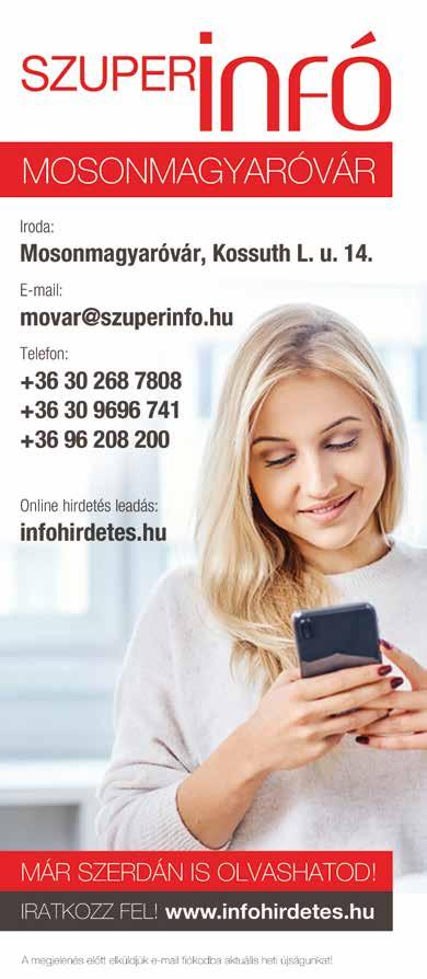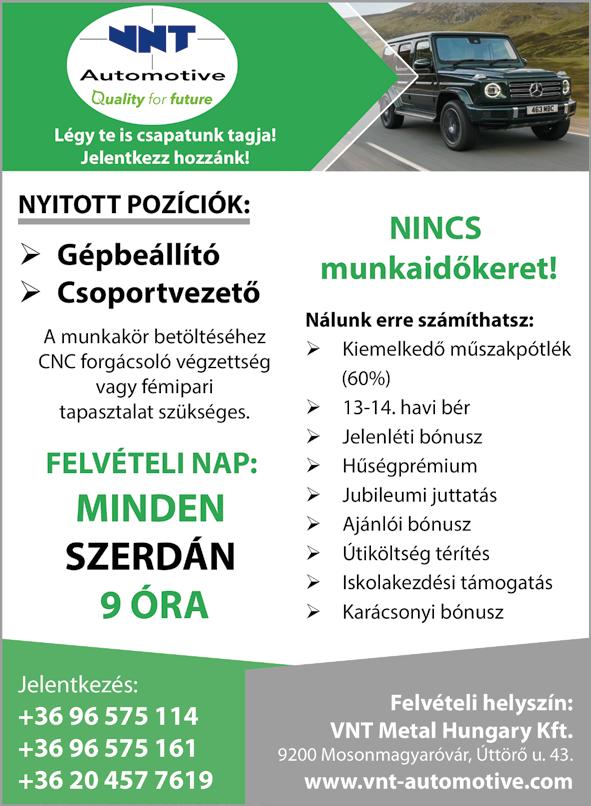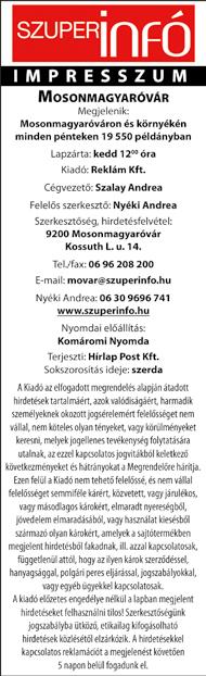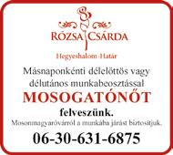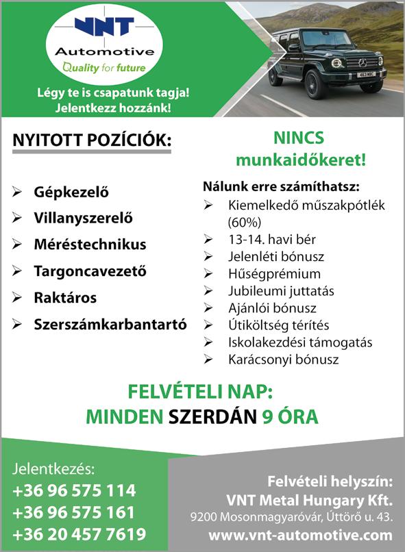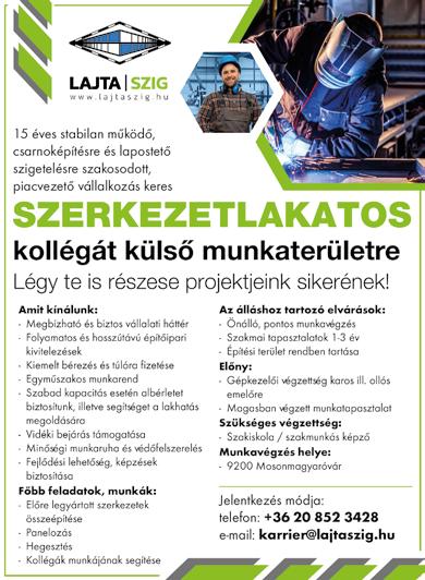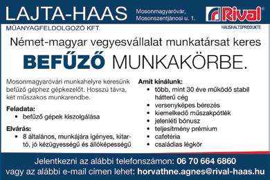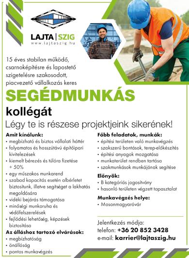 Ácsot, tetőfedőt felveszek Mosonmagyaróvár és környékére. Bérezés: megegyezés szerint. Tel.: 06-20-9-457-593 Óváron fogászatba, hajnali takarításra takarítónőt keresek, 3 óra/nap, heti 3-4 alkalom. Friss nyugdíjasnak is kedvező munka! Érd.: 06-30-518-0903