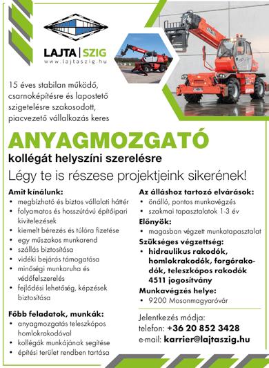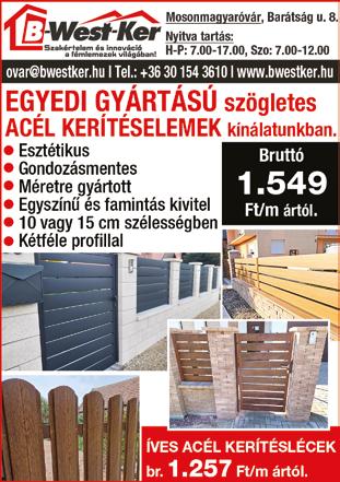 150 m˛ EPS 80-as 10 cm-es külső homlokzati hungarocell 2.390 Ft/m2 eladó valamint 100 m EPS 100-as 5 cm-es lépésálló hungarocell 1.390 Ft/m˛ eladó és hozzá kiegészítők. Tel.: 06-30-6103850. www.rbfnyilaszarokft. hu, Bősárkány, Almáskert u. 1. Bősárkányban kitermelt humusz föld 100 mł mennyiség eladó 3.000 Ft/mł áron eladó! Tel.: 06-30-5801-041 Száraz nyárfa és száraz akácfa konyhakészen rendelhető, füstölni való akác fűrészpor eladó. EUTR: AA0351717. Tel.: 06-30-400-9597
