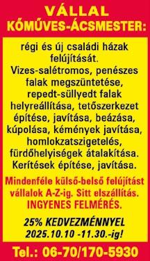 Vállalom 25% kedvezménnyel! Családi házak felújítását, vizes, salétromos, penészes falak injektálását, gipszkartonozást. Szigetelést, parkettázást, festést, burkolást, víz- és villanyszerelést, kémények helyreállítását és tisztítását, kúpolások és mindenféle átalakításokat, nyugdíjasoknak tavalyi áron. 2025. 10. 10 – 11. 30. T.: 06-70/780-6136.