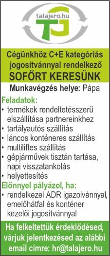 Műanyagtermék – gyártó gép kezelője (PVC nyílászárók gyártása) Árukiszállító, raktáros Pék Tehergépkocsi vezető (C+E kategóriás jogosítvány)