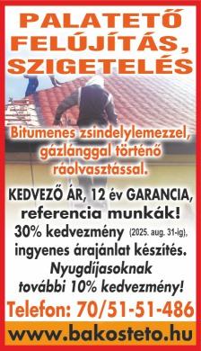 Fűnyírást vállalok. Tel.:20/9666-868 Régi tetők felújítása, palatető javítása, tetőfedő és bádogos munkák. Új tetők, teraszok, garázstetők építése. Cserepeslemez kedvező áron bármilyen tetőre. Saját anyaggal is dolgozunk. 15% kedvezmény szeptember 30-ig. Ingyenes felmérés. +3620/568-5384