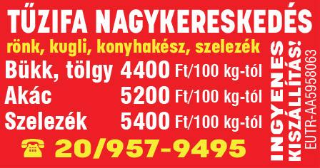 • Tűzifa eladó! Tölgy 35.000 Ft/ m3, nyárfa 25.000 Ft/m3 kiszállítva. Tel: 06-30/217-5575, 06-70/506-8000 EUTR: AA5987762