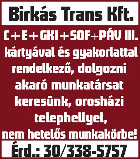 • Hetelős-napi hazajárós sofőrt keresünk! C-E kategória, GKI, PÁV vizsga, sofőr kártya. Érd: 06-30/565-2462 Molnár Gergő
