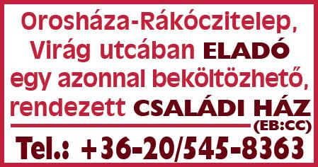 Orosháza-Rákóczitelep, Virág utcában eladó egy azonnal beköltözhető, rendezett családi ház. (EB: CC) Tel.: +3630/545-8363
