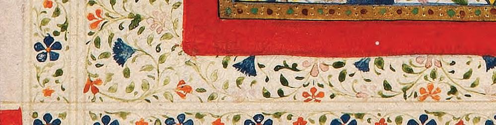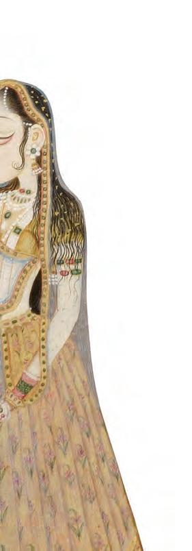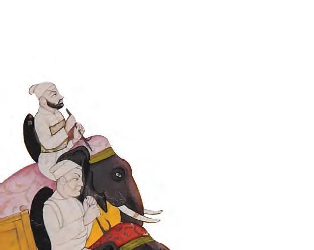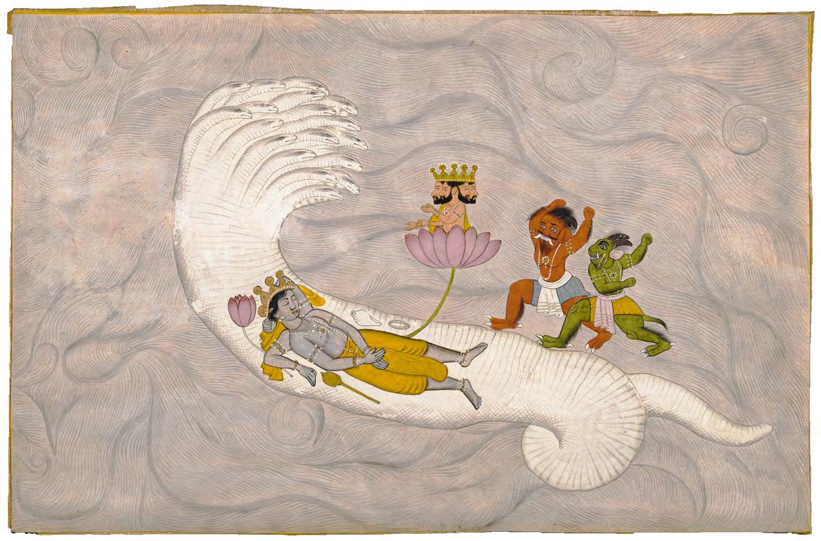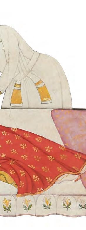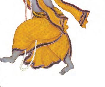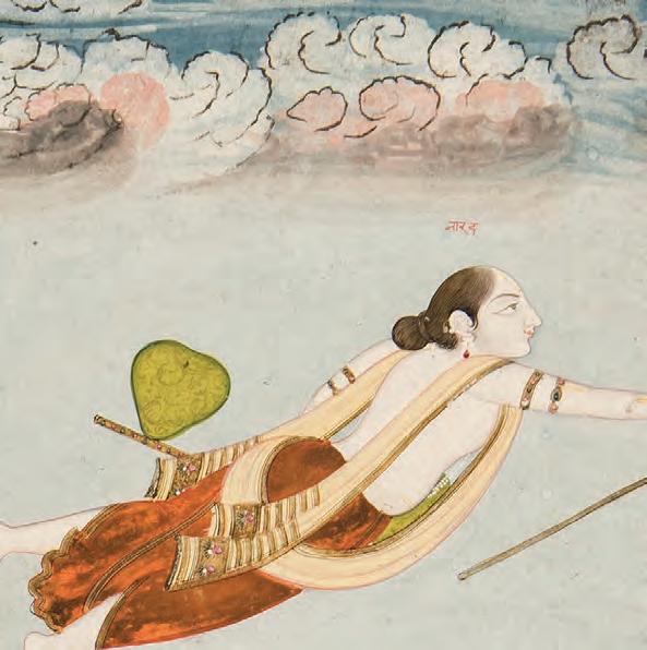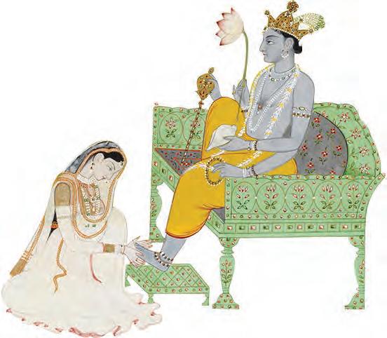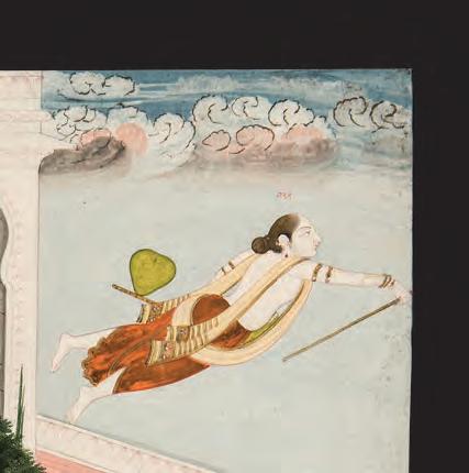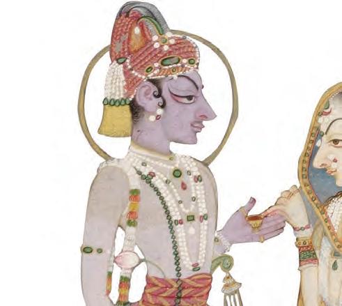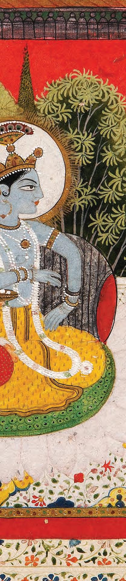 or through the implementation of Mughal aesthetics by Bundi artists. Regardless of the motivation, Bundi painting transformed during the 1700s from a heavily Rajput style to one that paid respect to the Mughal archetype while still maintaining its unique air. e present image is representative of an earlier work, celebrating the divinity and power of Vishnu through the Gajendra Moksha narrative. e scene is meant to convey feelings of surrender and trust, essential components in the devotee’s relationship with god.