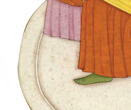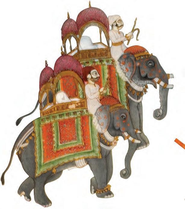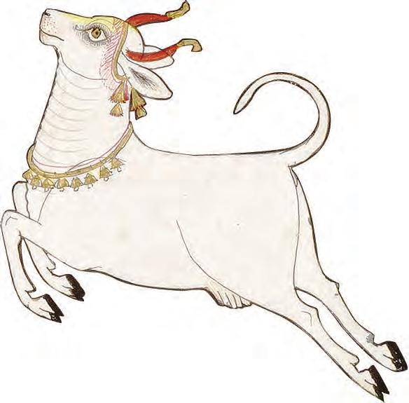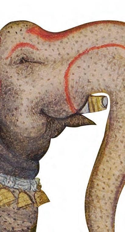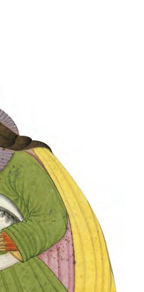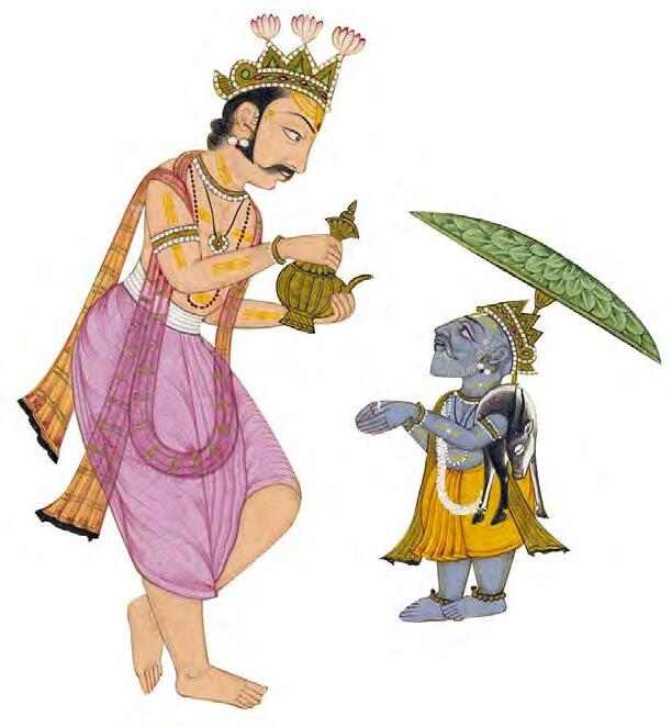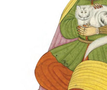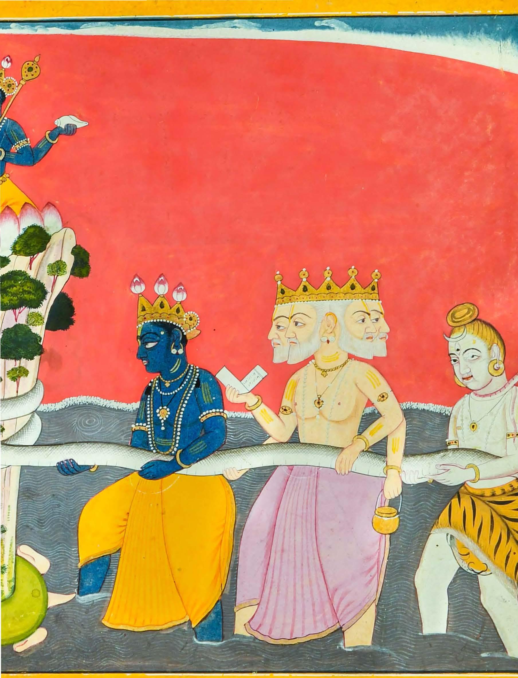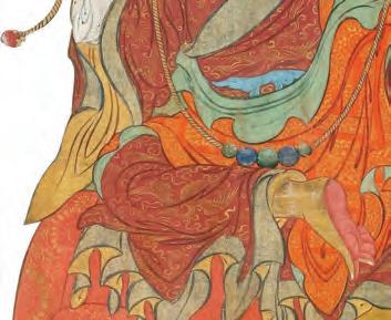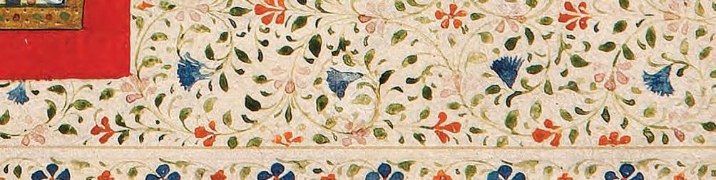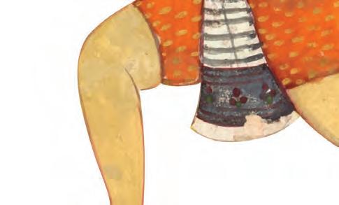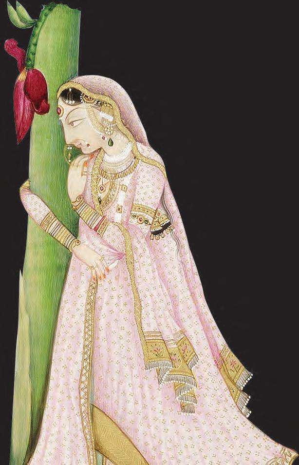 or through the implementation of Mughal aesthetics by Bundi artists. Regardless of the motivation, Bundi painting transformed during the 1700s from a heavily Rajput style to one that paid respect to the Mughal archetype while still maintaining its unique air. e present image is representative of an earlier work, celebrating the divinity and power of Vishnu through the Gajendra Moksha narrative. e scene is meant to convey feelings of surrender and trust, essential components in the devotee’s relationship with god.