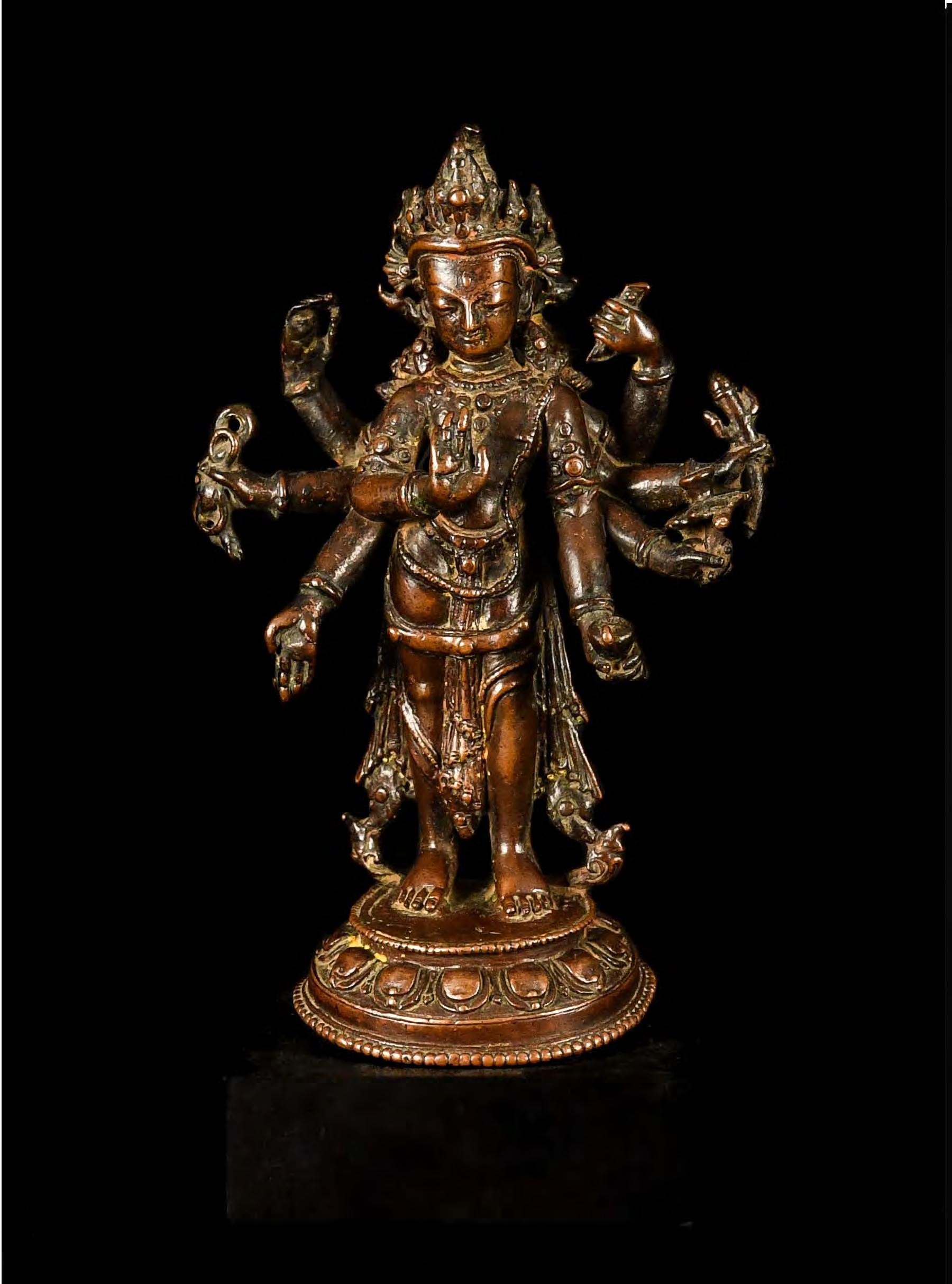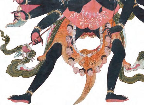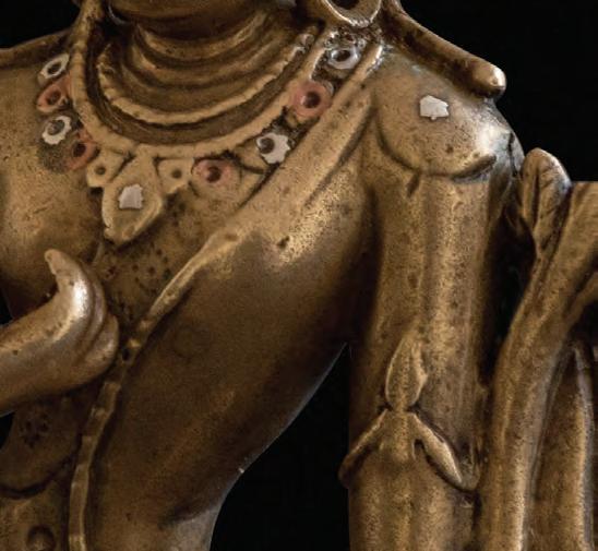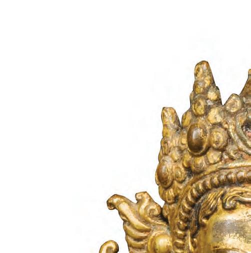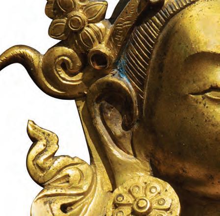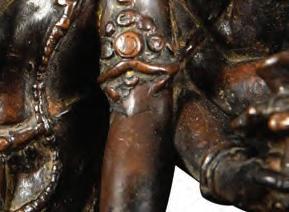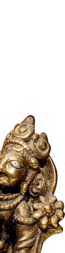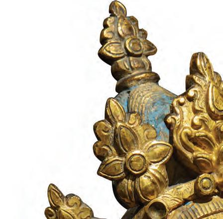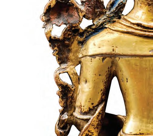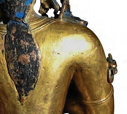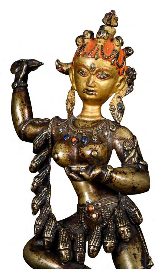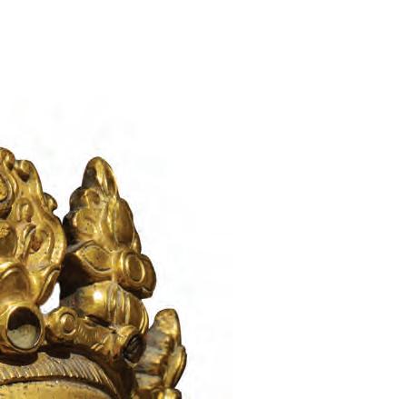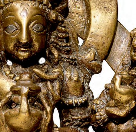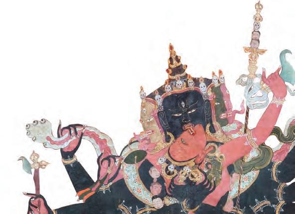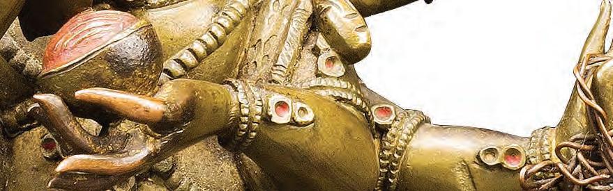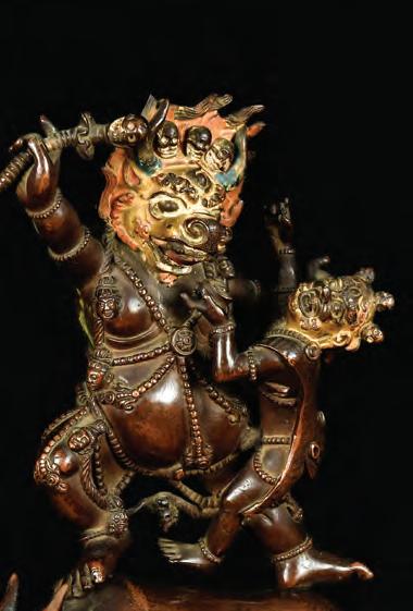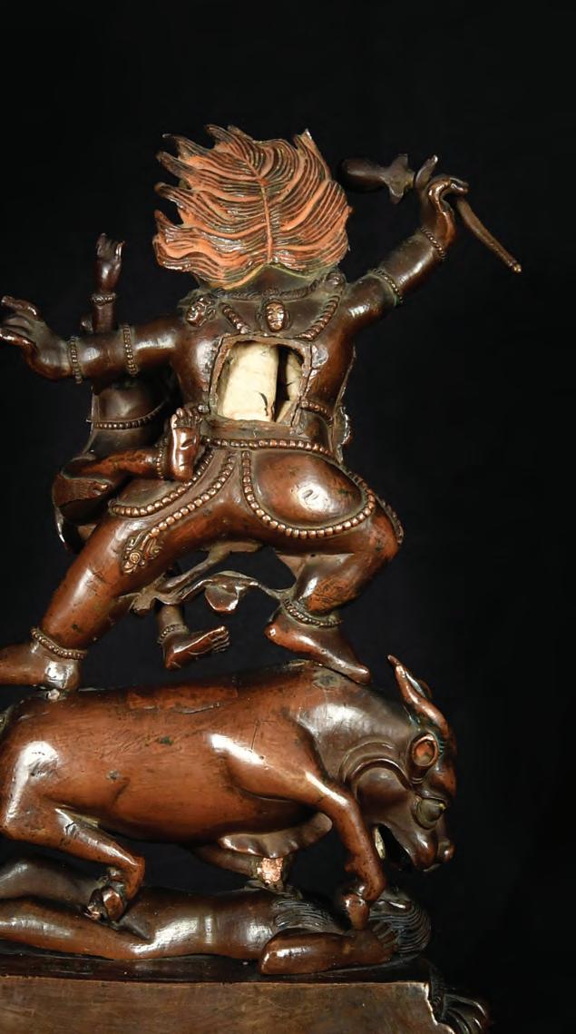 amongst the Gelukpa order of Tibetan Buddhism. Shadbhuja is recognized as the erce, powerful, and wrathful embodiment of the Bodhisattva of compassion Avalokiteshvara. In this elegantly cast piece attention to fine detail is evident throughout the sixarmed form. In the primary le hand is a skull cap (kapala) lled with minced remains of enemies to Dharma. In the primary right hand lies a crescent shaped chopper (katrika) or curved knife, which corresponds to the shape of the skull cap so it can be utilized for making the “mincemeat ” The chopper is a representation of detachment from samsaric existence. Within the secondary right hand lies a damaru,