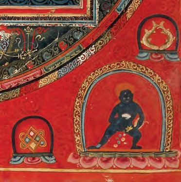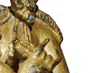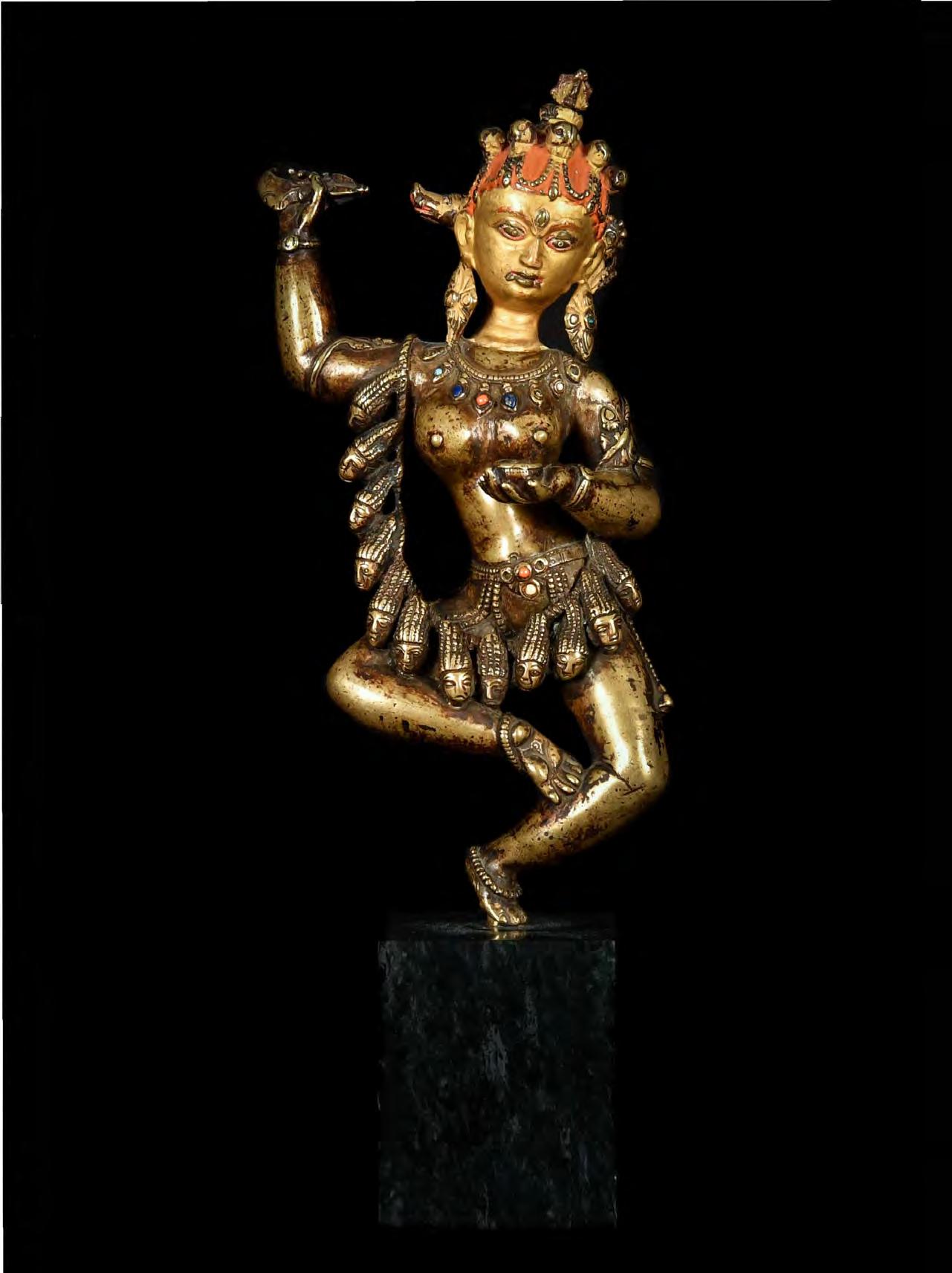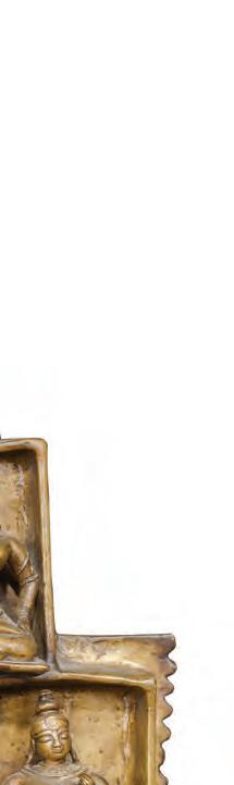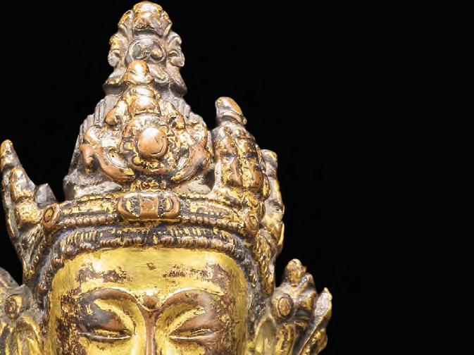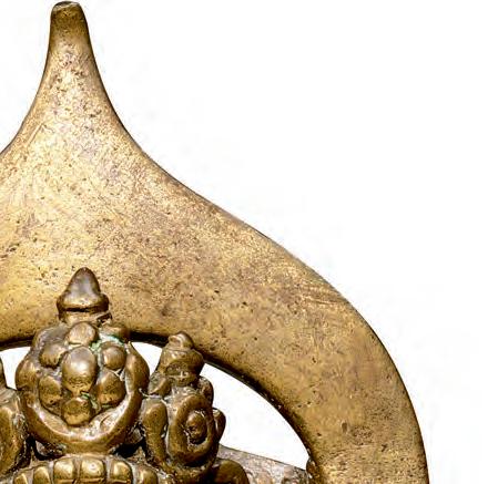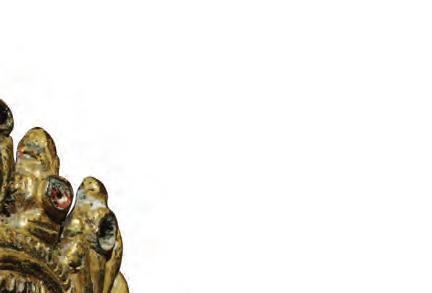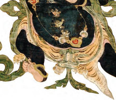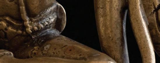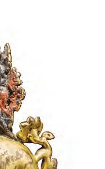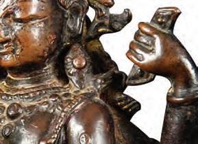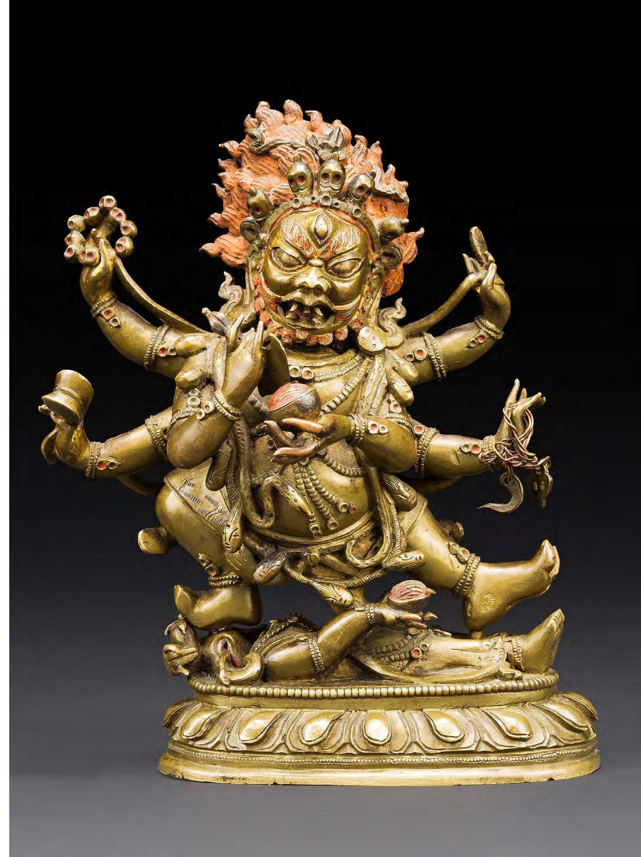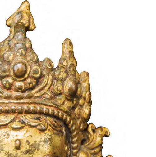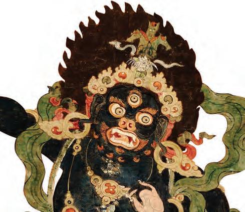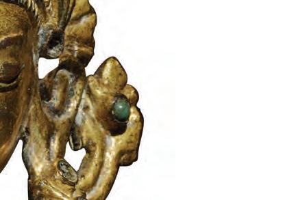 amongst the Gelukpa order of Tibetan Buddhism. Shadbhuja is recognized as the erce, powerful, and wrathful embodiment of the Bodhisattva of compassion Avalokiteshvara. In this elegantly cast piece attention to fine detail is evident throughout the sixarmed form. In the primary le hand is a skull cap (kapala) lled with minced remains of enemies to Dharma. In the primary right hand lies a crescent shaped chopper (katrika) or curved knife, which corresponds to the shape of the skull cap so it can be utilized for making the “mincemeat ” The chopper is a representation of detachment from samsaric existence. Within the secondary right hand lies a damaru,