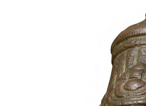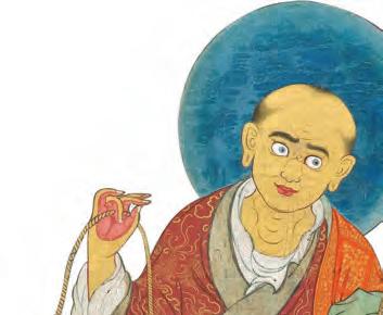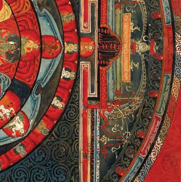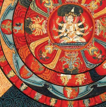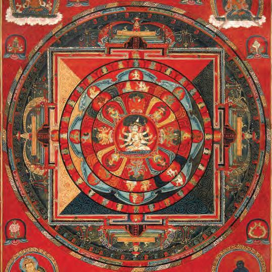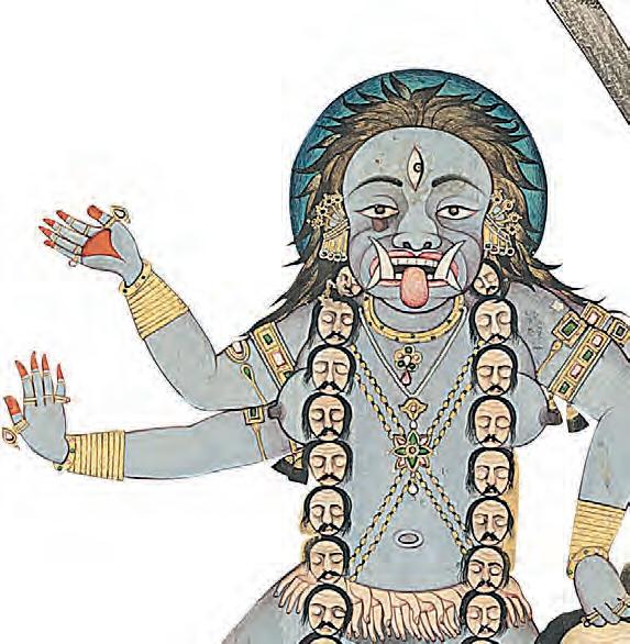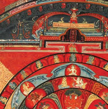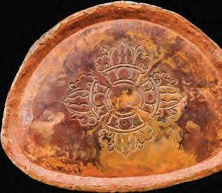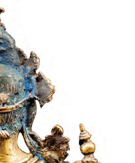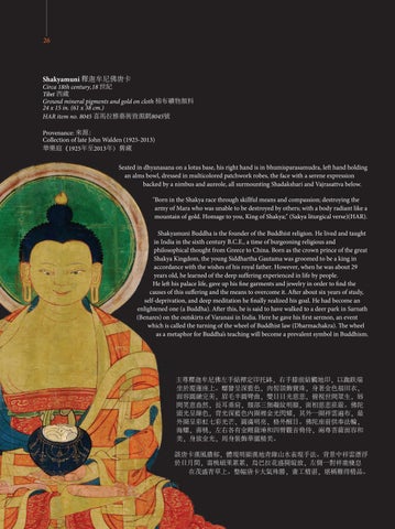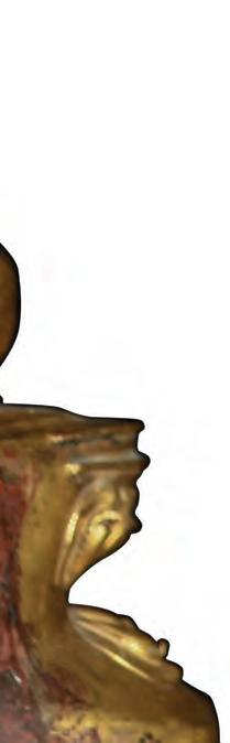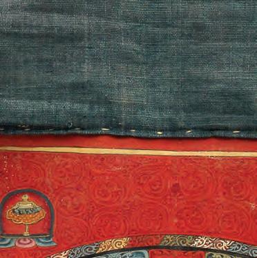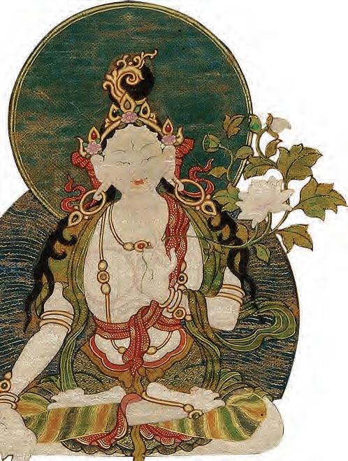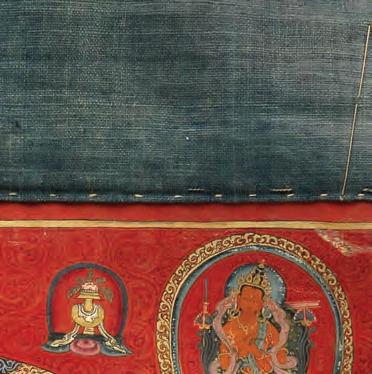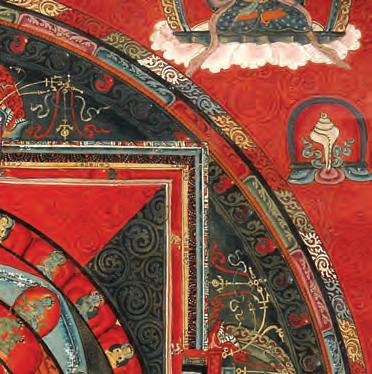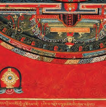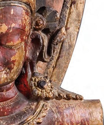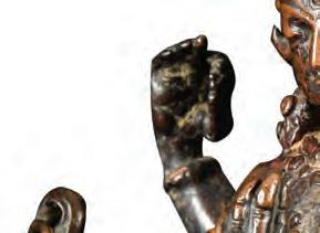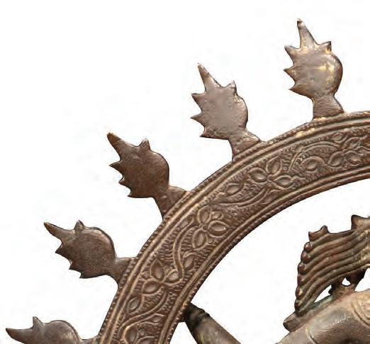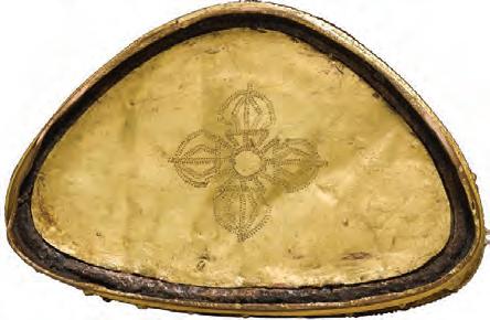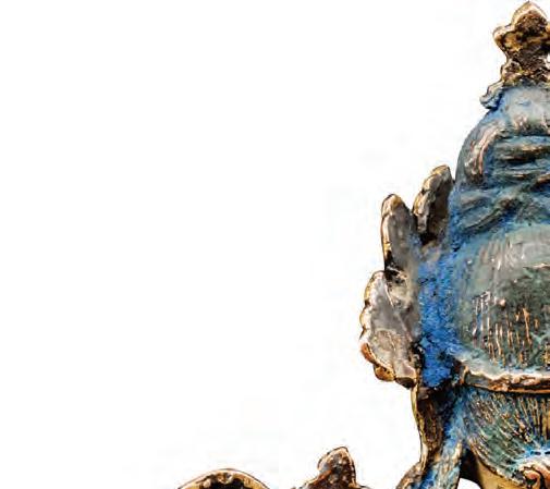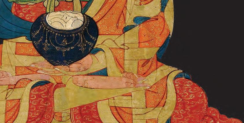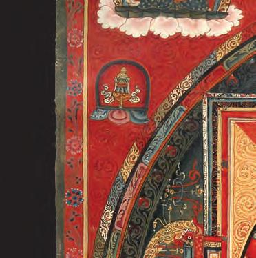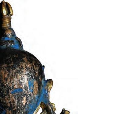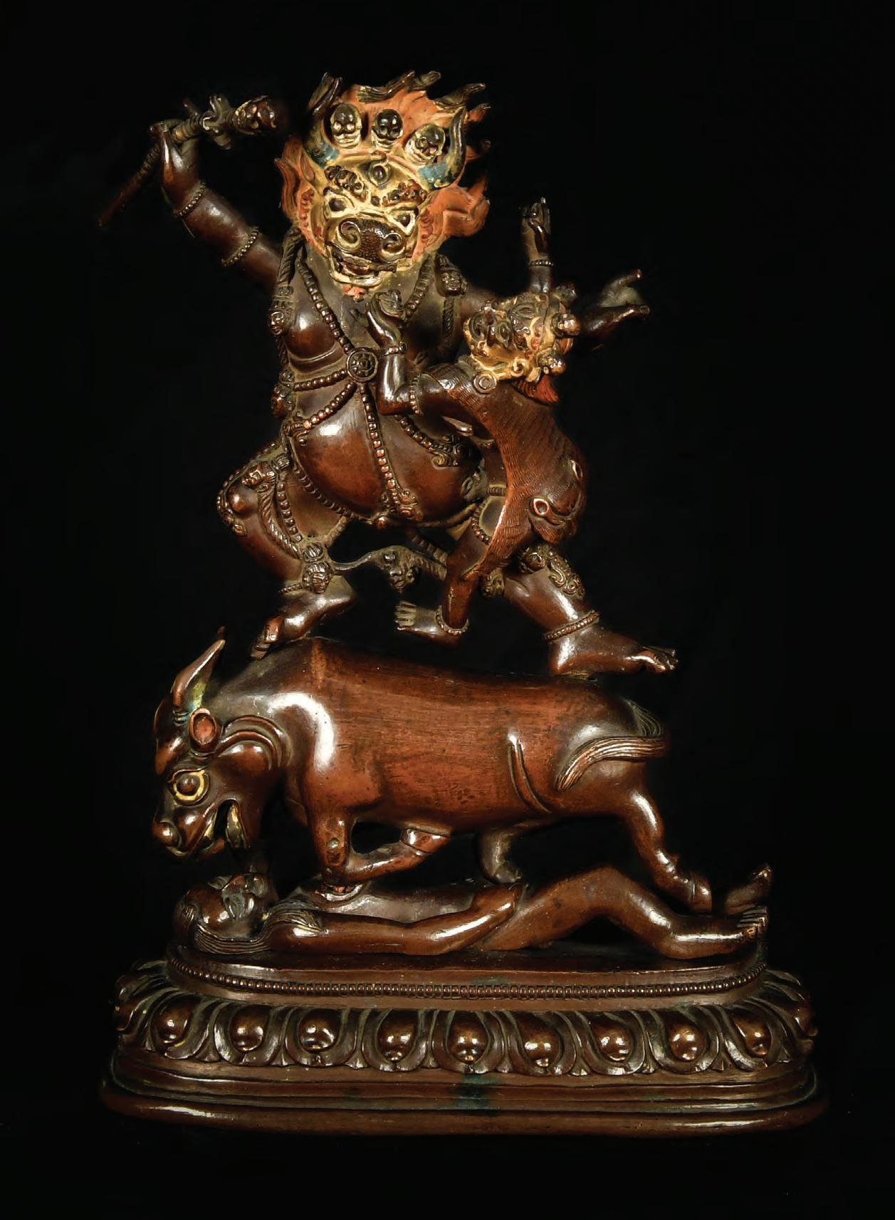 amongst the Gelukpa order of Tibetan Buddhism. Shadbhuja is recognized as the erce, powerful, and wrathful embodiment of the Bodhisattva of compassion Avalokiteshvara. In this elegantly cast piece attention to fine detail is evident throughout the sixarmed form. In the primary le hand is a skull cap (kapala) lled with minced remains of enemies to Dharma. In the primary right hand lies a crescent shaped chopper (katrika) or curved knife, which corresponds to the shape of the skull cap so it can be utilized for making the “mincemeat ” The chopper is a representation of detachment from samsaric existence. Within the secondary right hand lies a damaru,