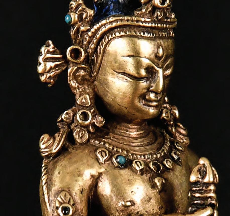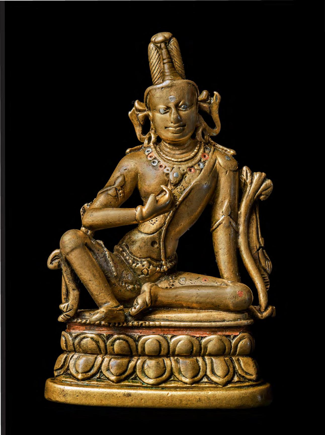 See also similar iconography on a larger figure of Vajrasattva, from the collection of A. and J. Speelman assigned to Central or Western Tibet, eleventh to twelfth century, illustrated in Marylin M. Rhie, and Robert A. F. Thurman, Wisdom and Compassion: The Sacred Art of Tibet, London, 1996, p.464, pl. 219. A possible origin of the unusual three-leaf crown type can be seen on an eleventh century Nepalese figure of Padmapani in the Cincinnati Art Museum, illustrated by Ulrich von Schroder, Indo-Tibetan Bronzes, Hong Kong, 1981, p. 329, pl. 86E.