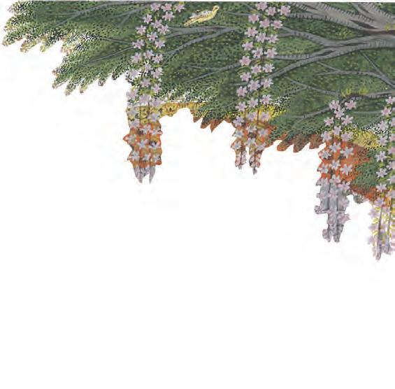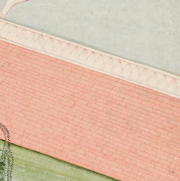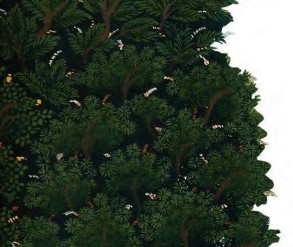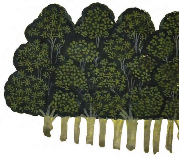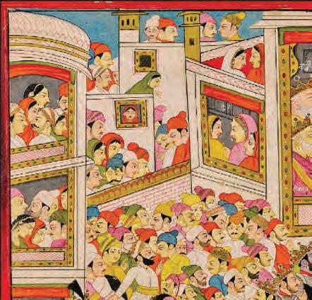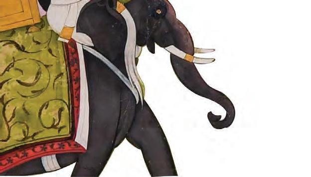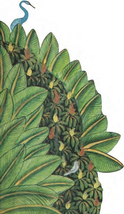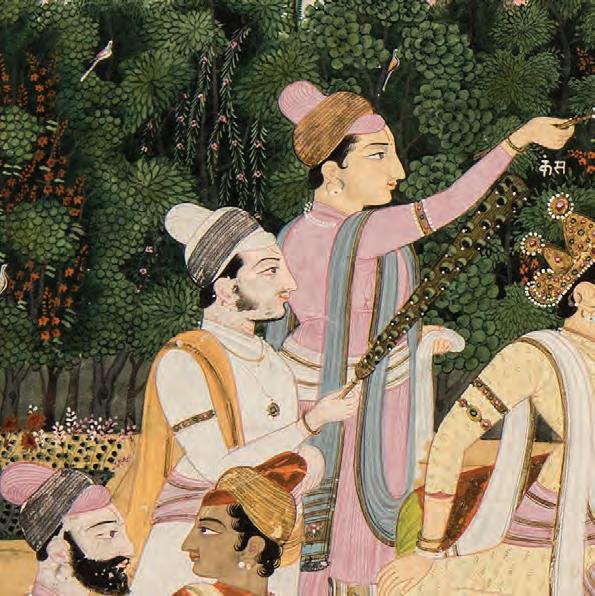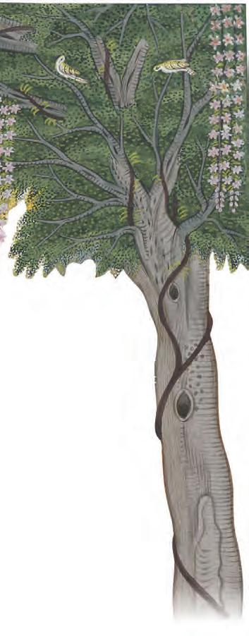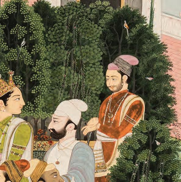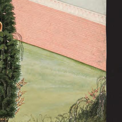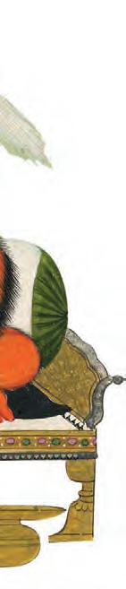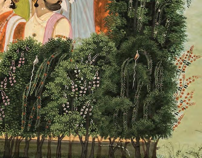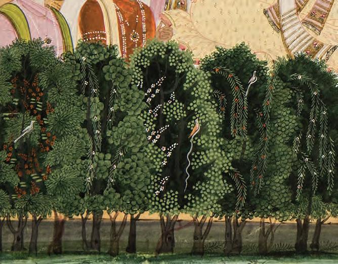 A host of onlookers and attendants watch from both behind and the foreground. Amongst the crowd Lakshmana is pictured bearing a fly Jambavan; the king of the bear army. Exceptional detail is given to the blooming tree stemming from behind Jambavan, with a creeping vine gracefully winding its way up the knots and texture of the trunk, leading the eye to the lush green leaves with owers hanging ripe with density giving host to frolicking birds.