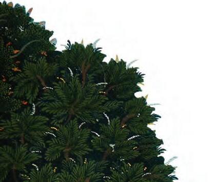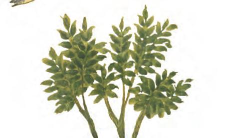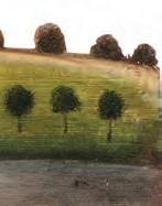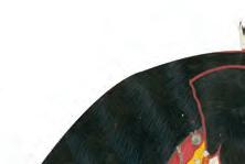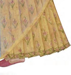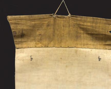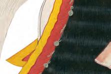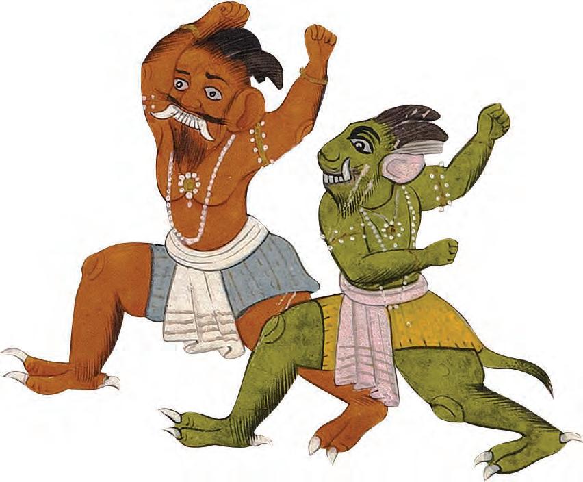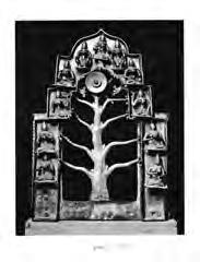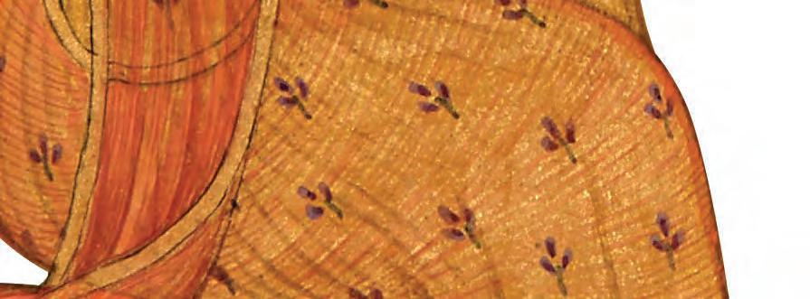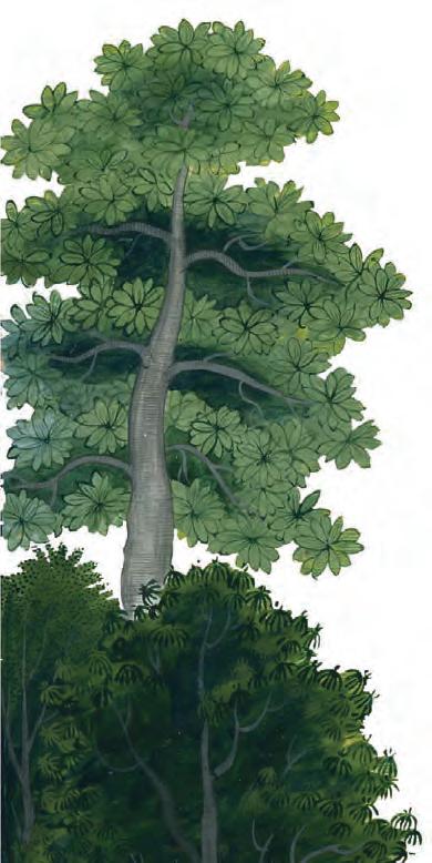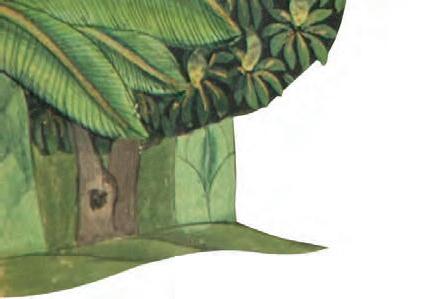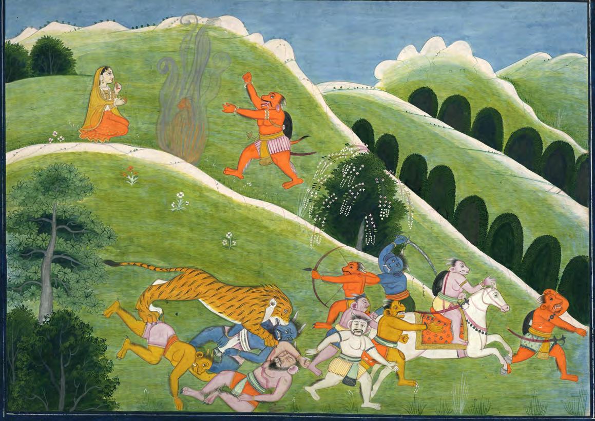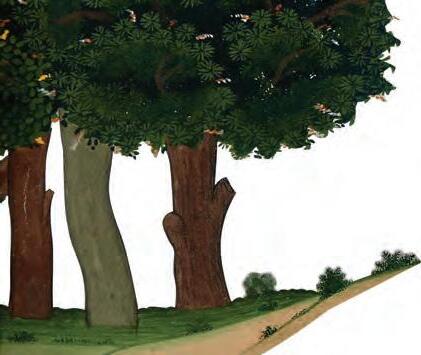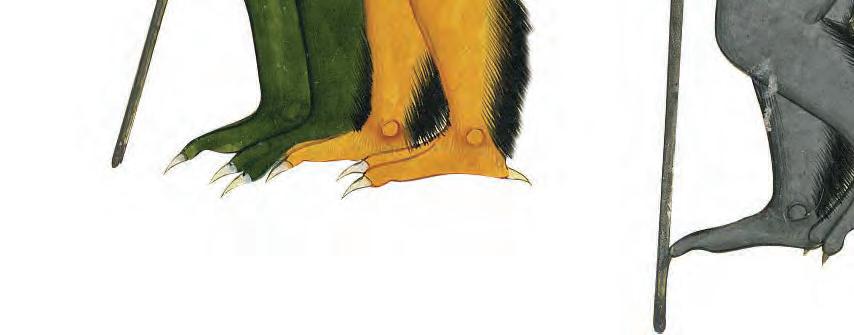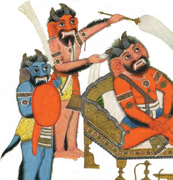 A host of onlookers and attendants watch from both behind and the foreground. Amongst the crowd Lakshmana is pictured bearing a fly Jambavan; the king of the bear army. Exceptional detail is given to the blooming tree stemming from behind Jambavan, with a creeping vine gracefully winding its way up the knots and texture of the trunk, leading the eye to the lush green leaves with owers hanging ripe with density giving host to frolicking birds.