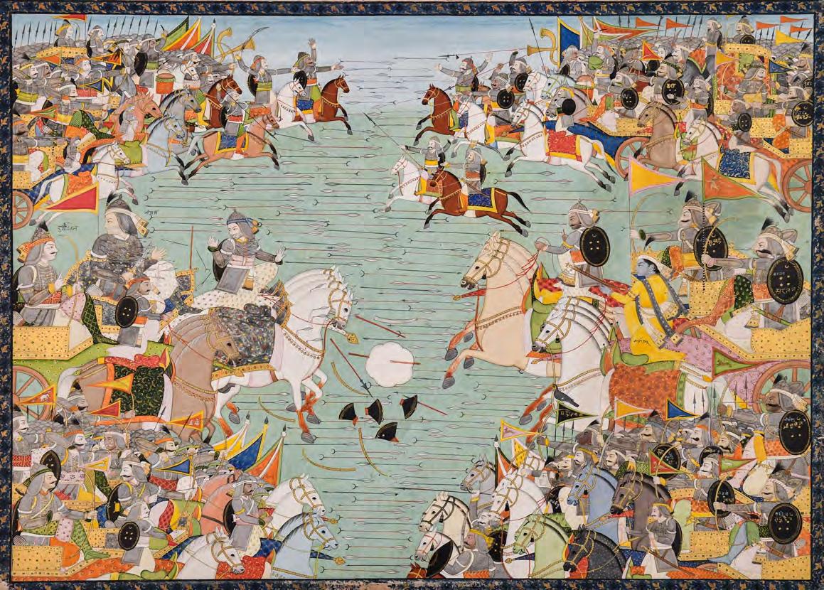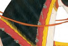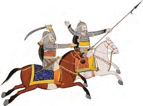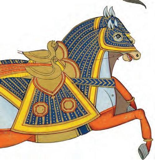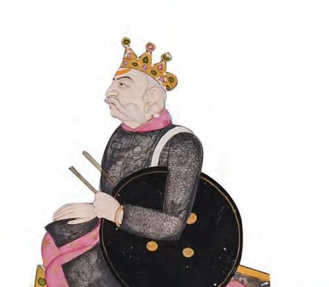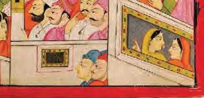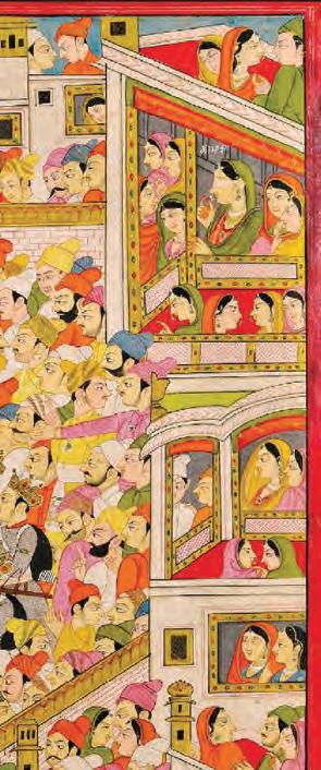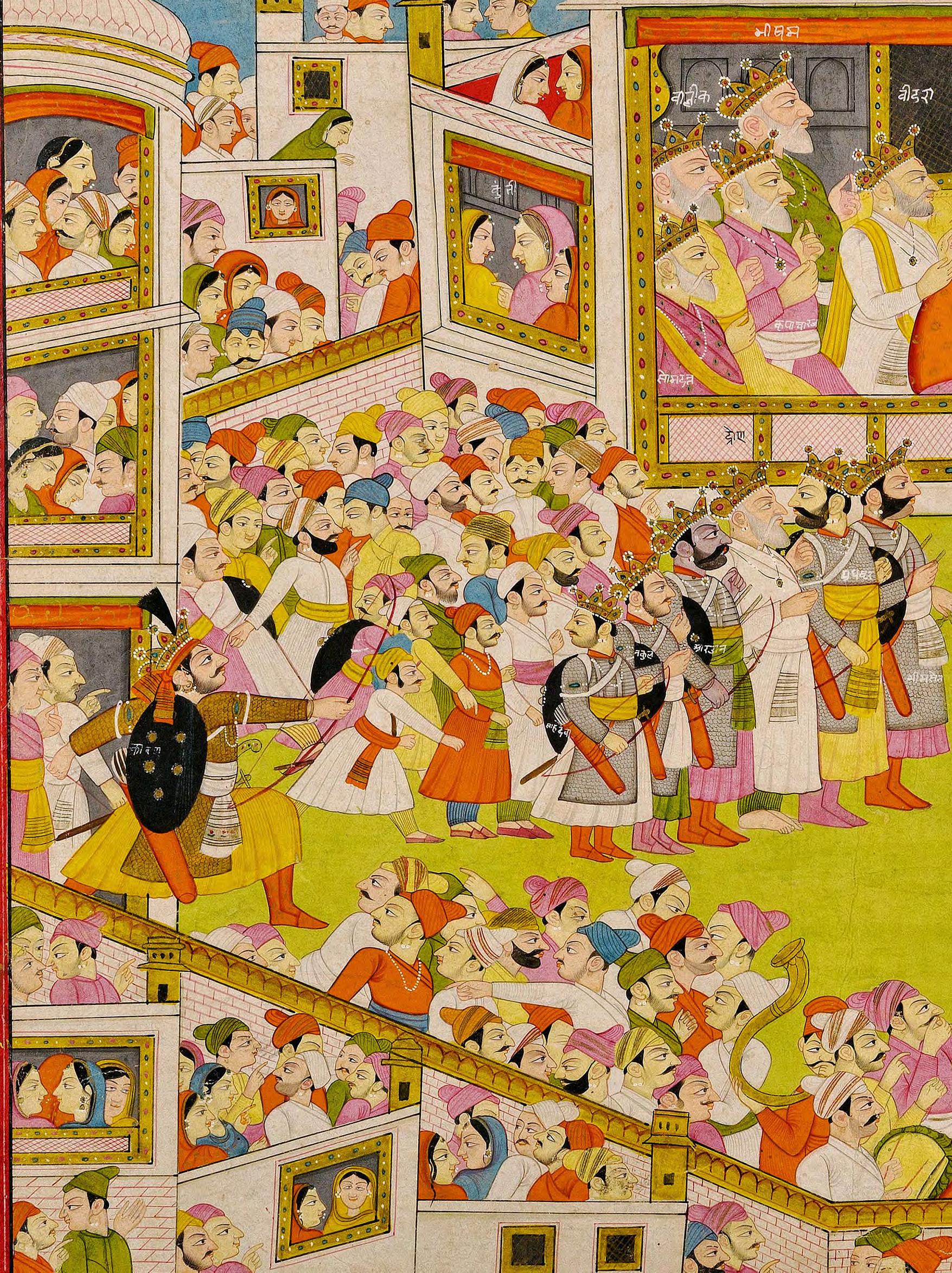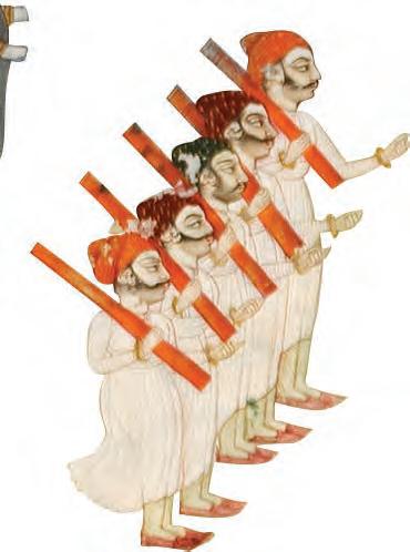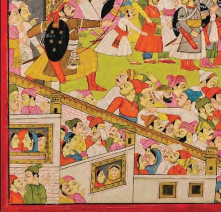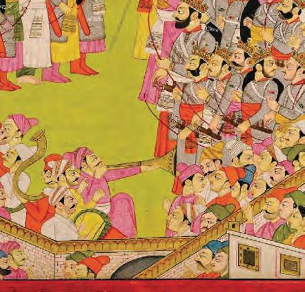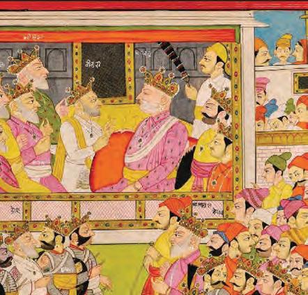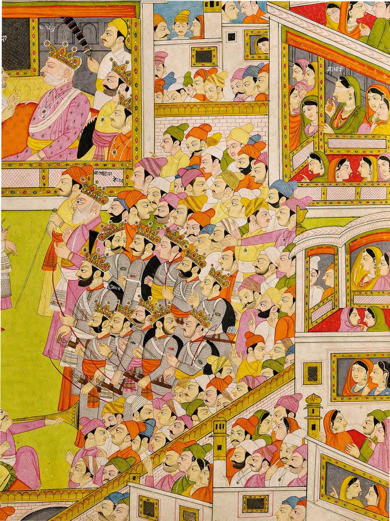 e Chauhan ruler Hamir speaking to his minister Jaja and his daughter Devala while Mahi ma consults with other courtiers within the walls of the Ranthambore fort, Hamir’s archers battle with Alauddin Khilji’s horsemen, Alauddin is depicted seated in a tented encampment with his men and European soldiers in brimmed top hats above, the names of gures inscribed in white and red devanagari script.