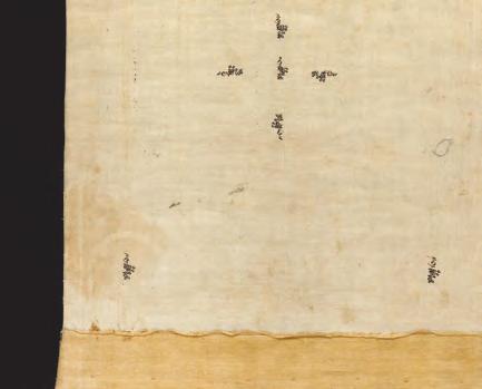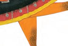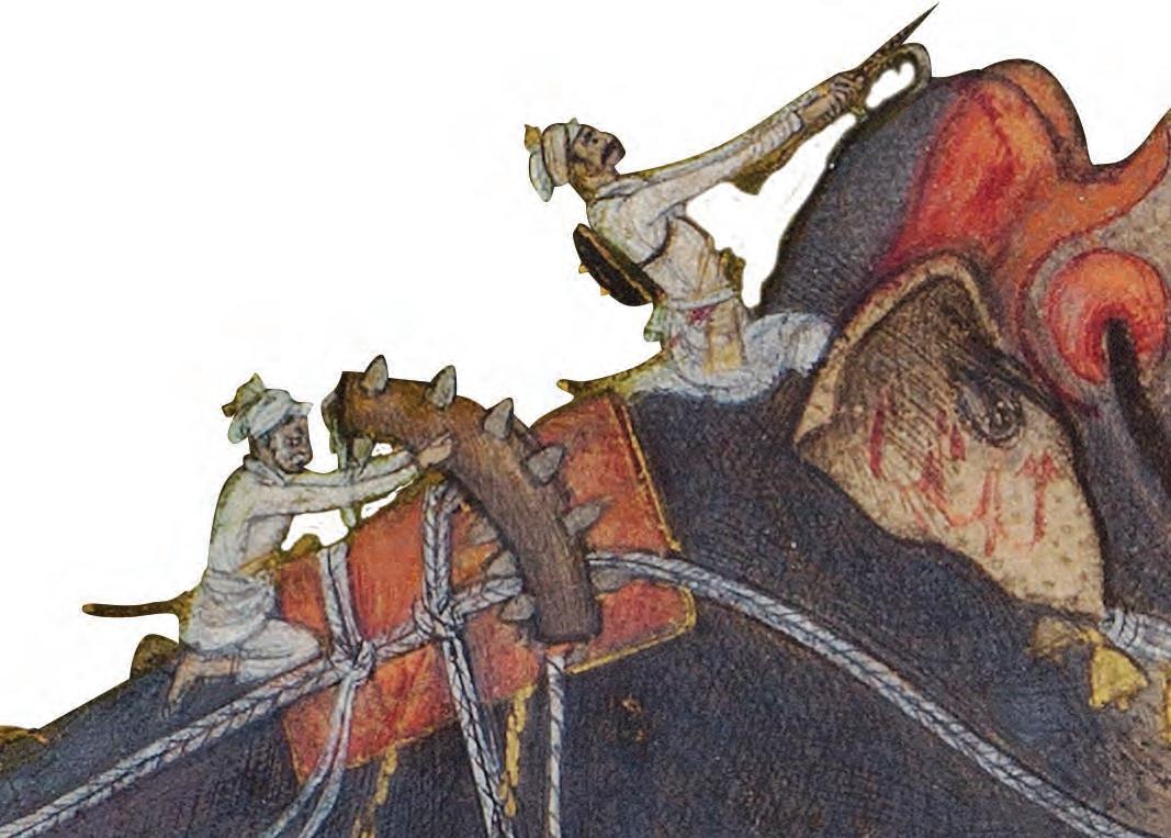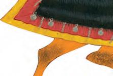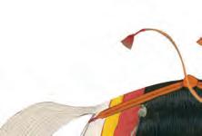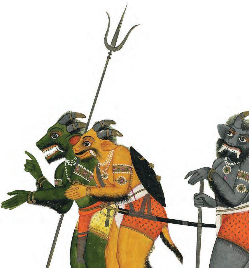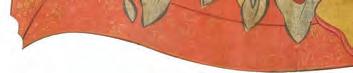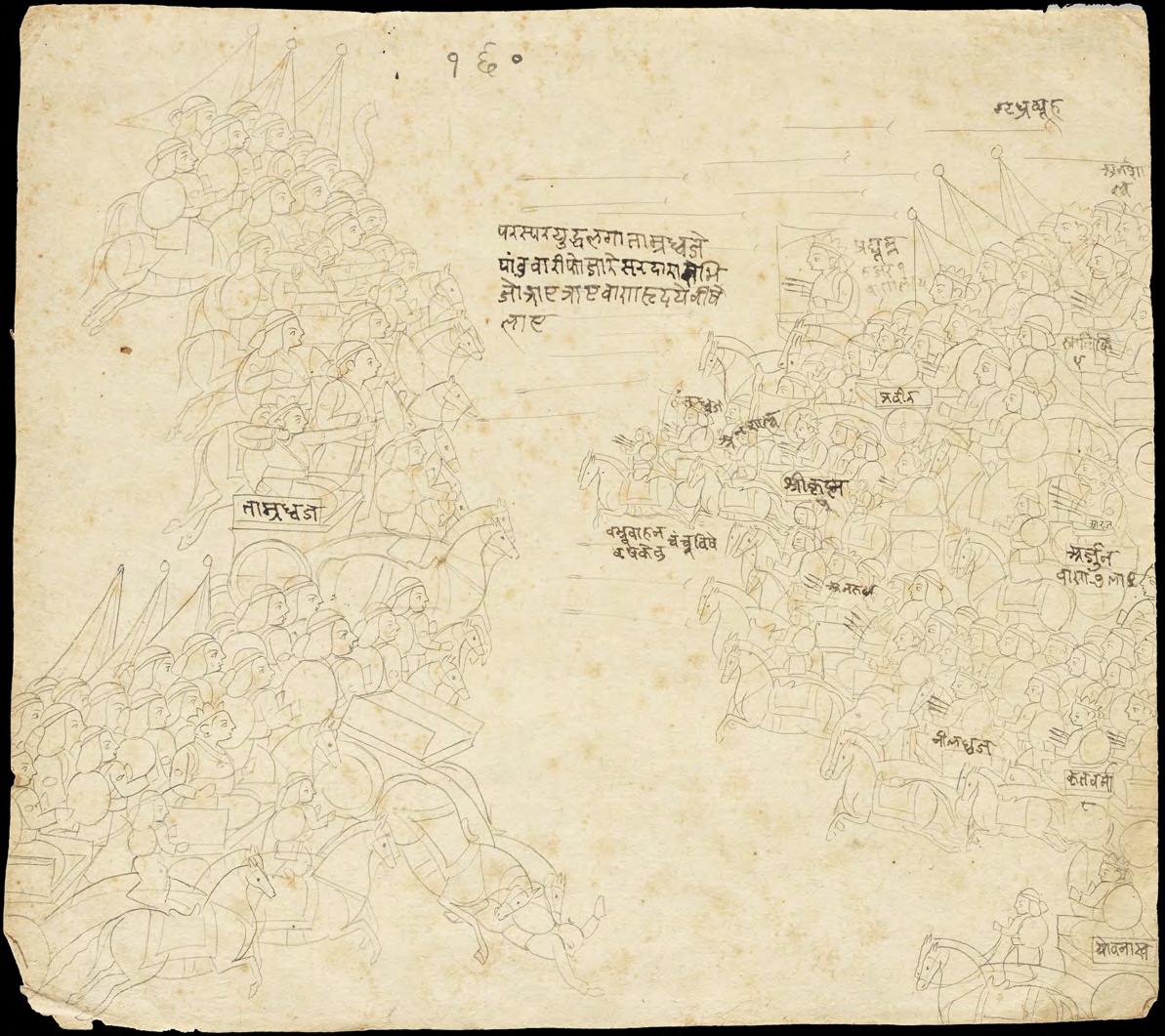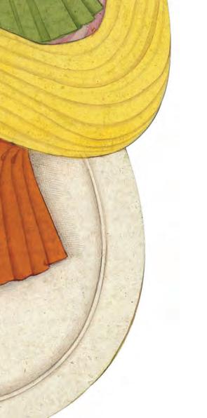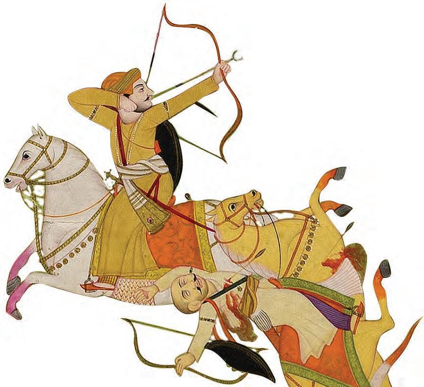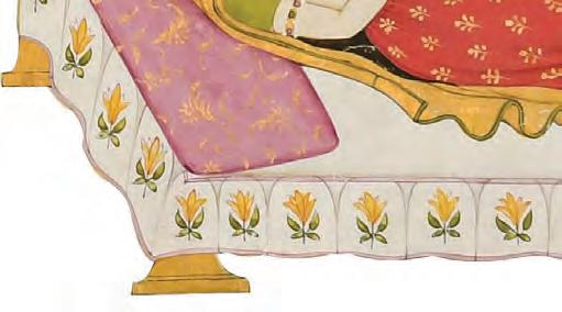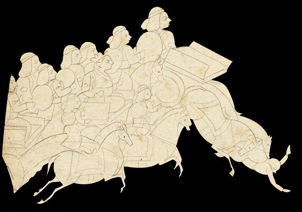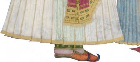 e Chauhan ruler Hamir speaking to his minister Jaja and his daughter Devala while Mahi ma consults with other courtiers within the walls of the Ranthambore fort, Hamir’s archers battle with Alauddin Khilji’s horsemen, Alauddin is depicted seated in a tented encampment with his men and European soldiers in brimmed top hats above, the names of gures inscribed in white and red devanagari script.