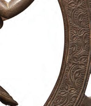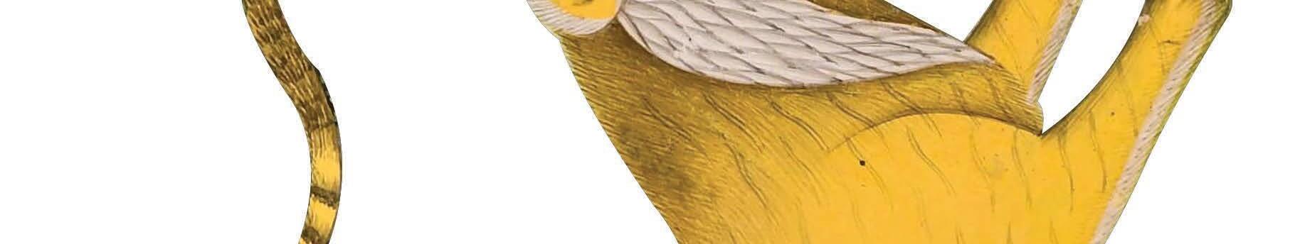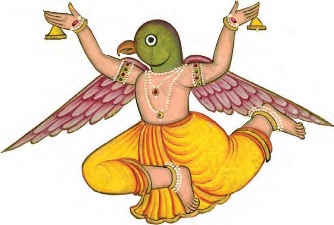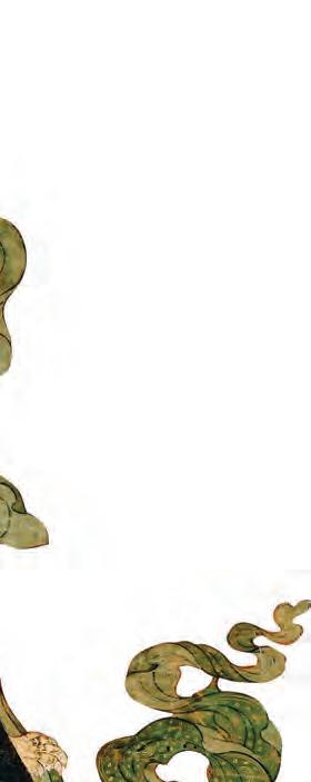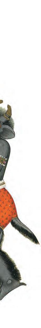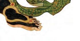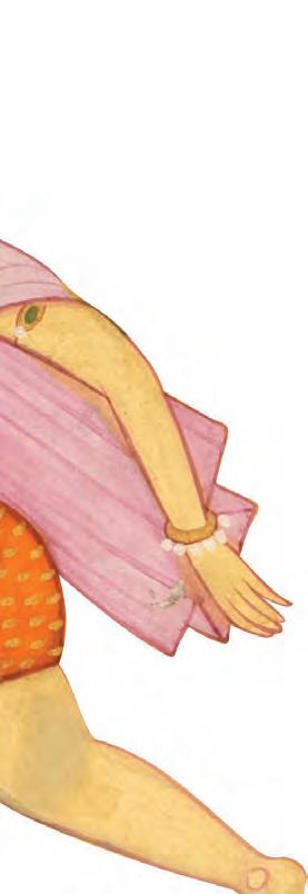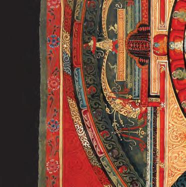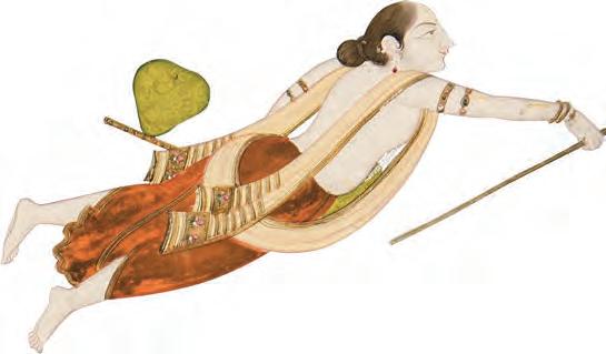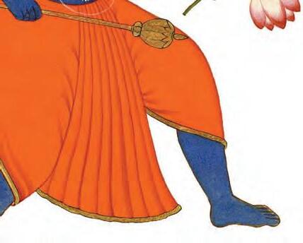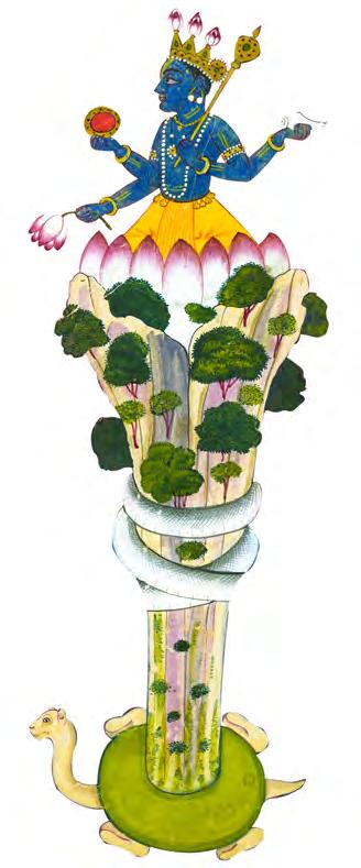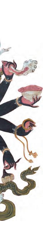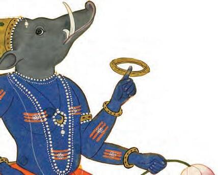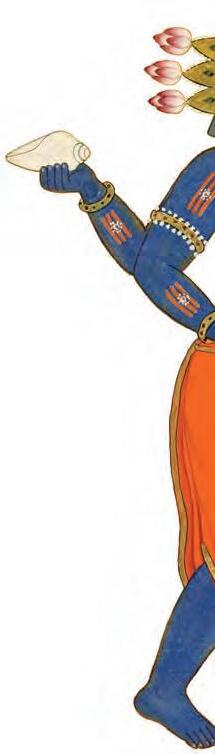 Amidst a rippling current, Vishnu rescues the king of elephants Gajendra from a crocodile makara. Gajendra had gone to bathe in a lotus lled lake when the makara caught the elephant, dragging him down into the water. e elephant struggled against the crocodile with all of his strength, but with each attempt at escape the crocodile’s grip tightened. In a nal e ort to thwart his demise, Gajendra cried out for Vishnu to save him, grabbing a lotus in his trunk to o er to the god. Vishnu heard the elephant’s pleas and appeared