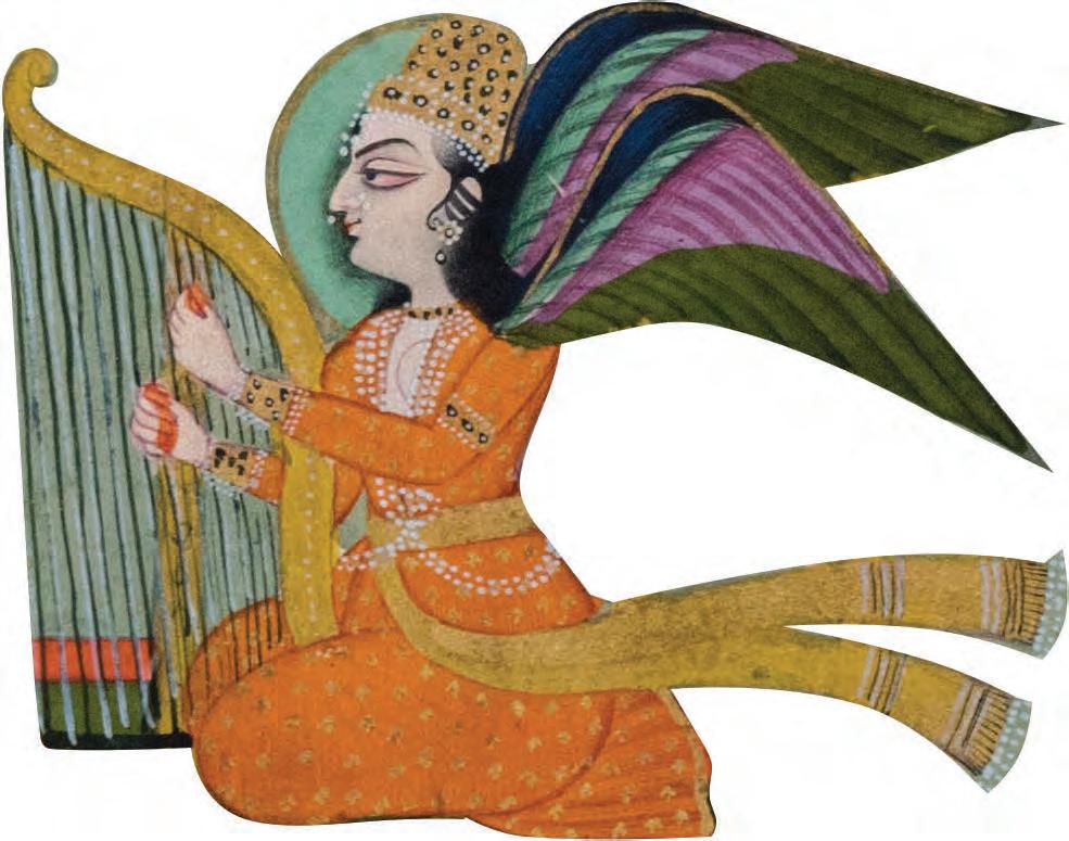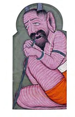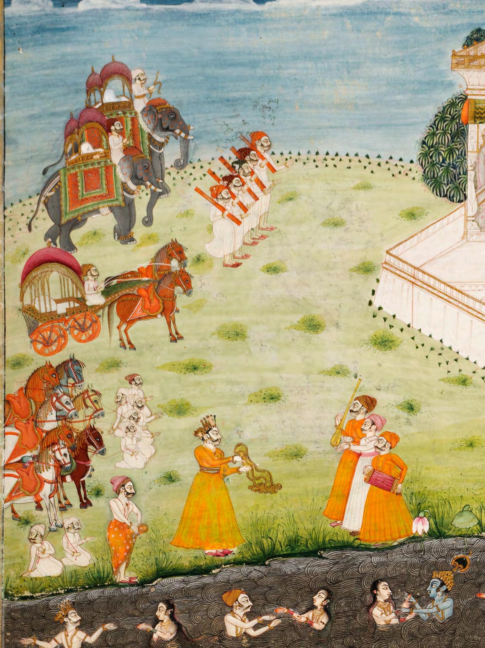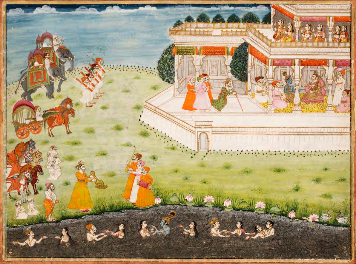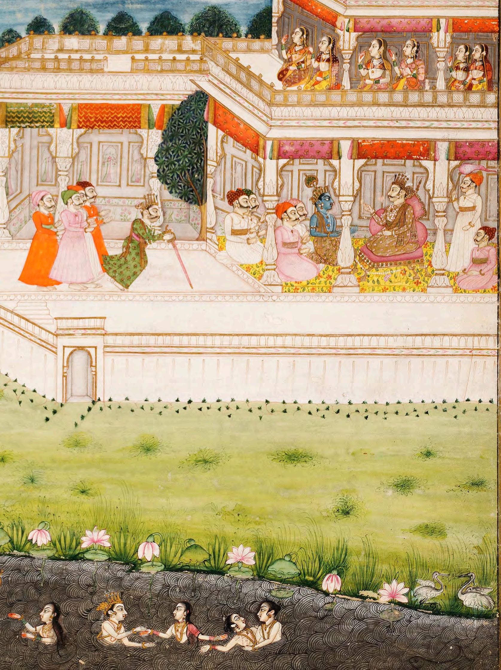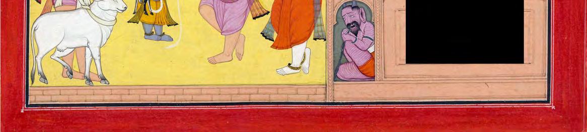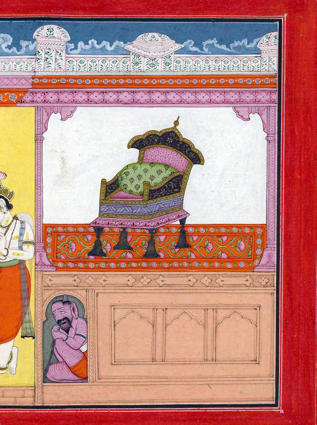 and he was quick to establish distinctions between one person and another… therefore Purkhu was best in rendering large groups: court scenes, processions, statefestivals, private celebrations, and the like. He was able to invest these scenes with the specific character of each occasion (Beach, 2011) In this particular painting our eye is immediately drawn to the foreground, where a courtly meeting surrounded by lush topiary is being held. A chowr y-bearer fans Kamsa (inscribed above crown) as the king watches Narada (inscribed in red), the most travelled sage, y away on the upper right, veena in hand. The lush surroundi g of the court scene re reminiscent of Purkhu’s most famous work for the Gita Govinda series often referred to as the Lambagraon Gita Govinda.