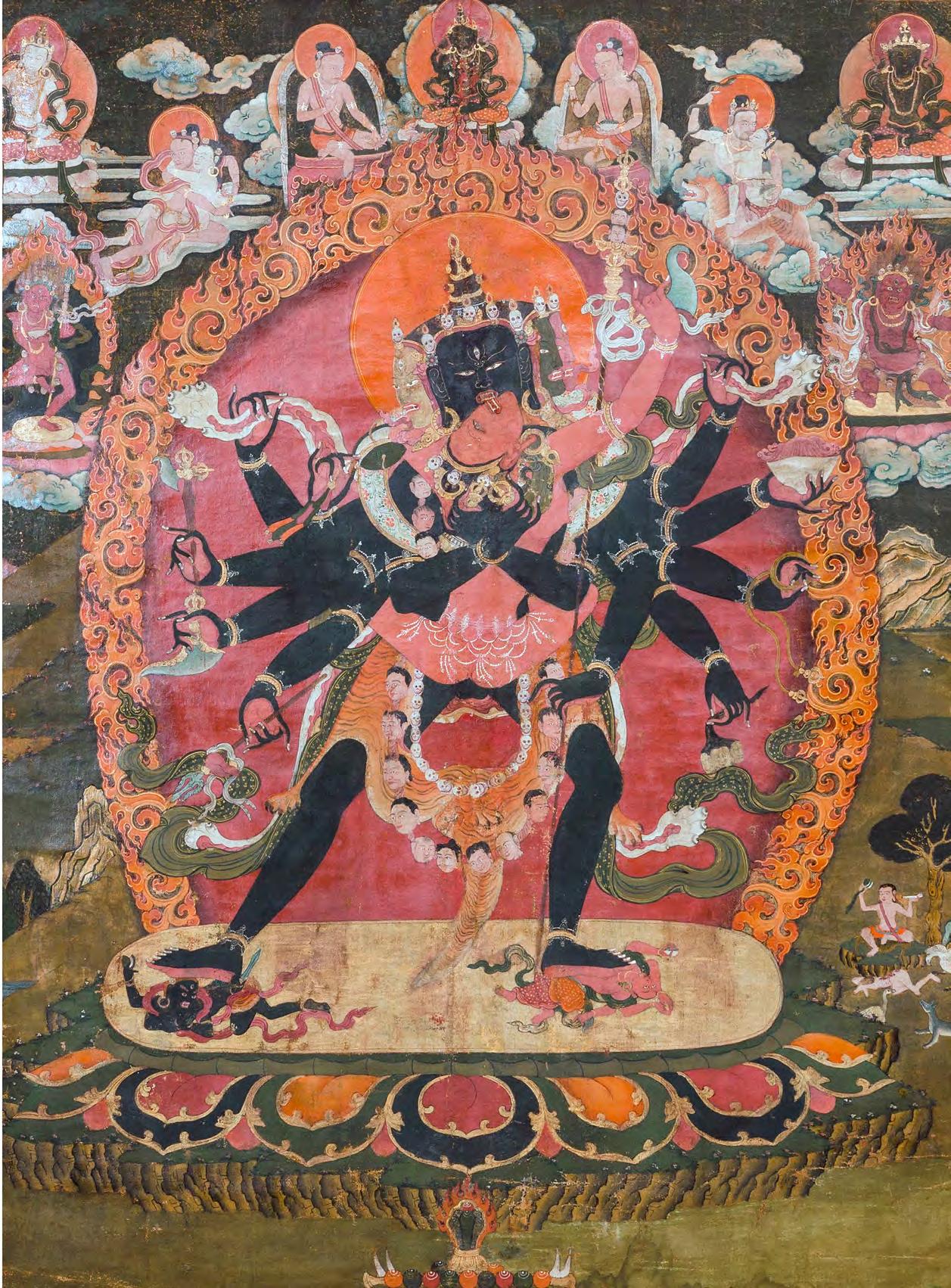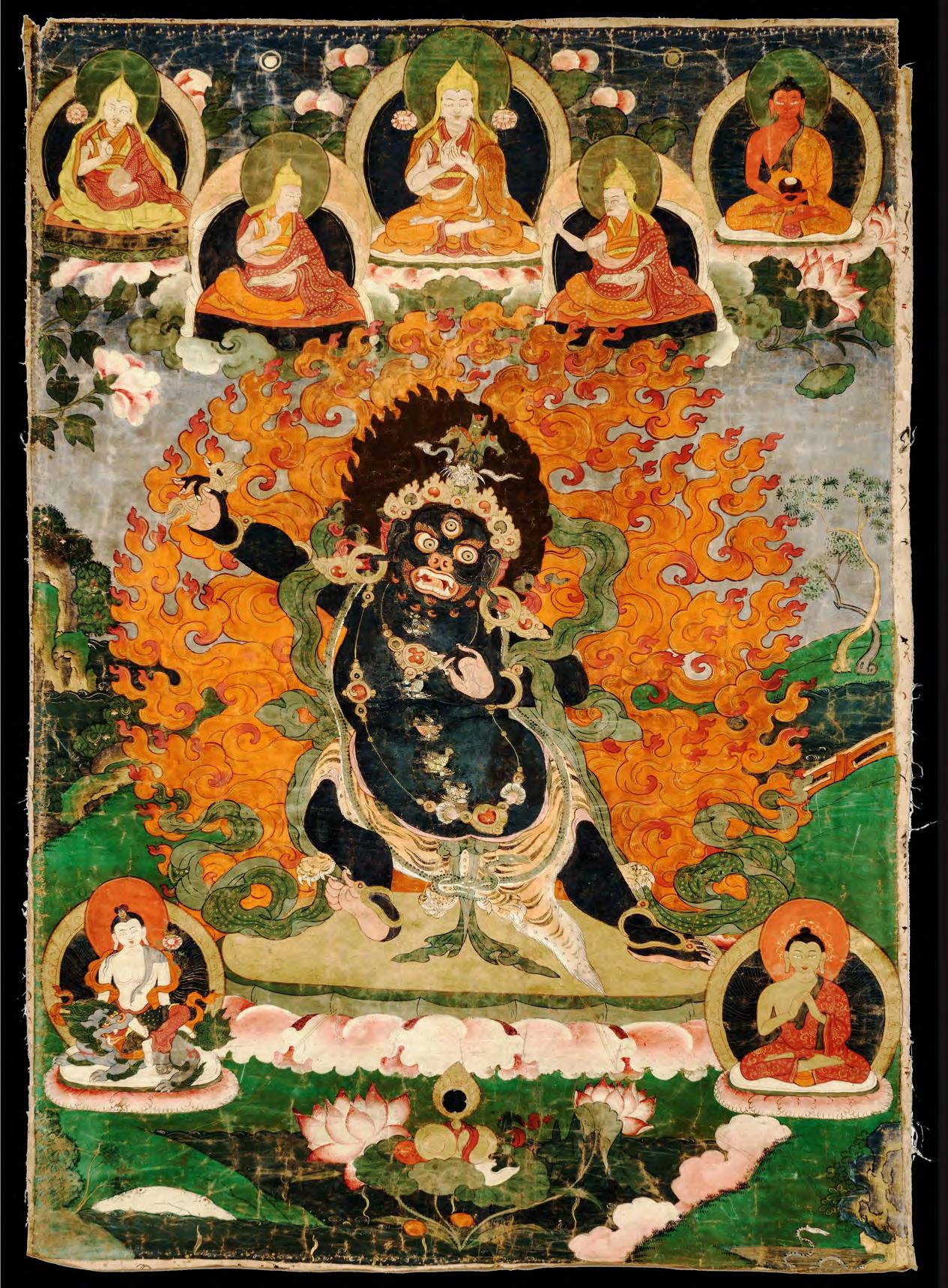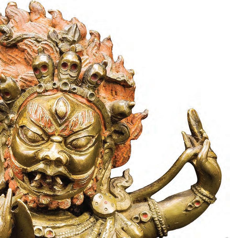 In Sanskrit Maha translates to great and Kala to time/death. Mahakala is the primary Buddhist Dharmapala and is respected in all schools of Tibetan Buddhism. All names and colors are said to melt into Mahakala, symbolizing his all-encompassing nature and lustrous black skin. He is seen as the absolute reality. Shadbhuja, the six-armed Mahakala, is a favorite