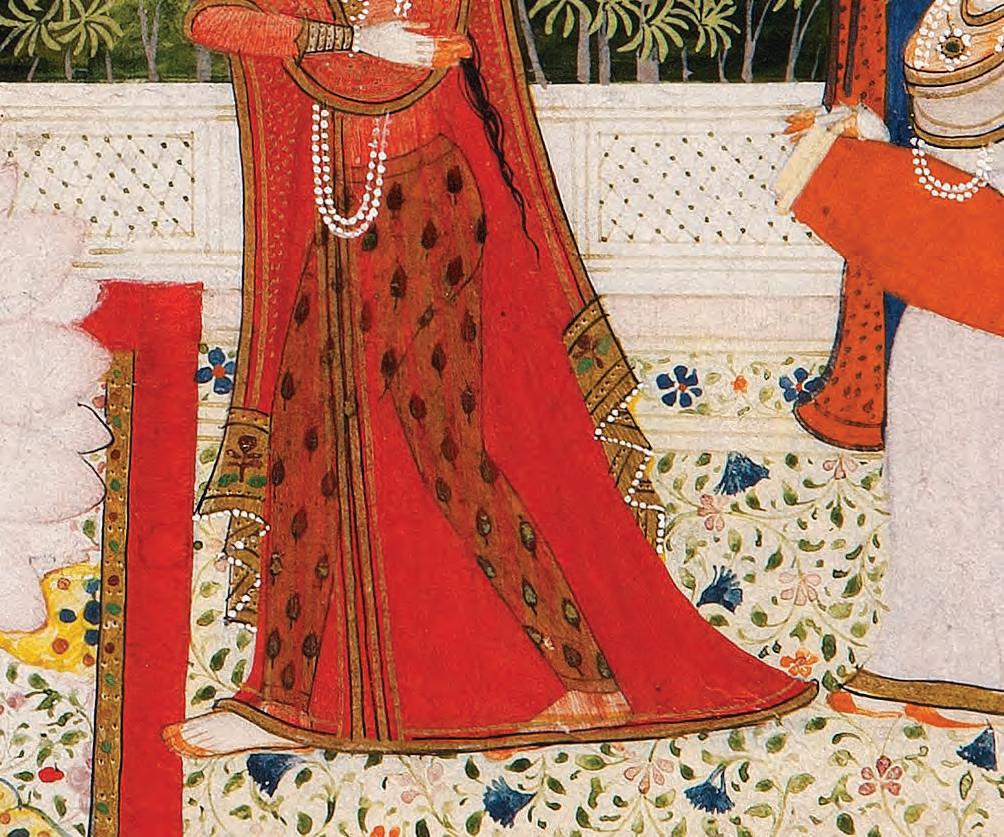The divine couple i enthroned on a deep red Mughal-style carpet with floral motif surmounted by a parasol bedecked in jewels and made of gold. Above, tufts of fabric panel re raised and tied in between concisely modeled arches.
