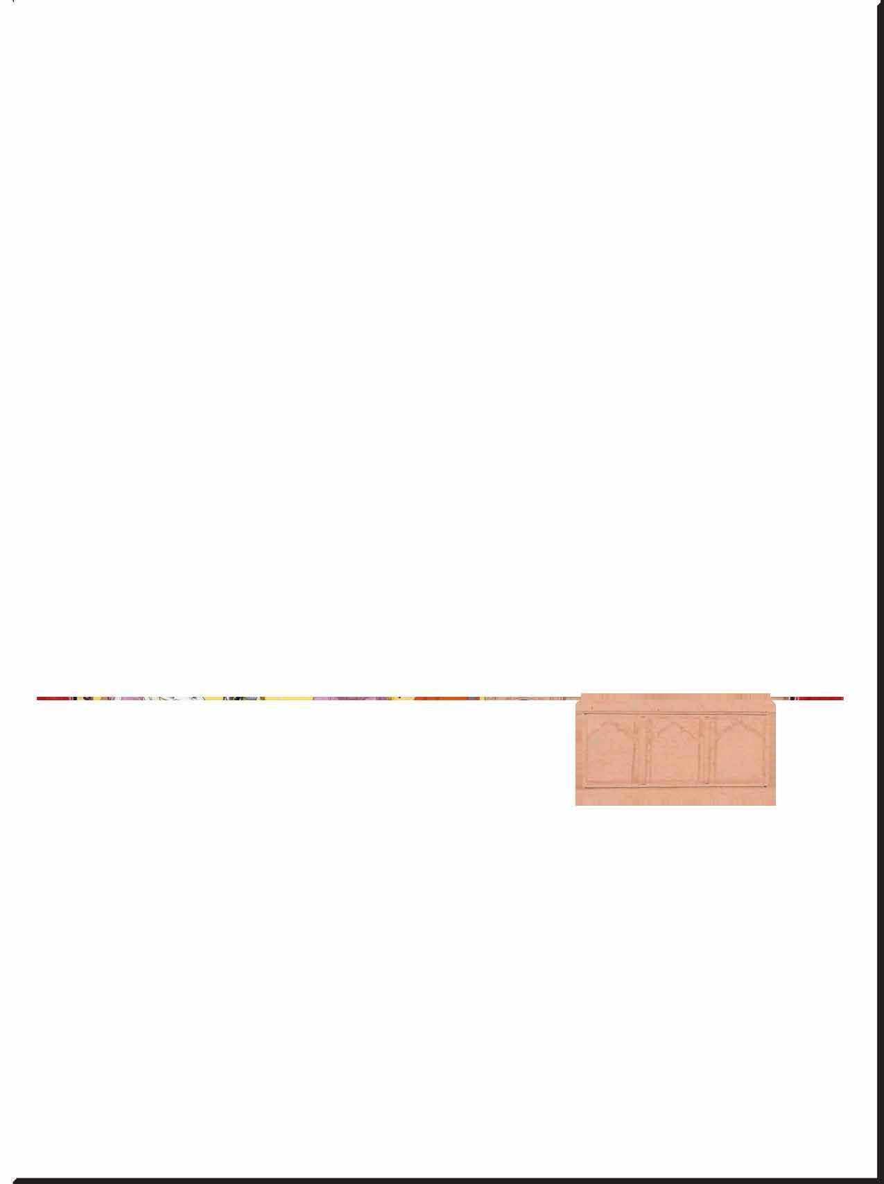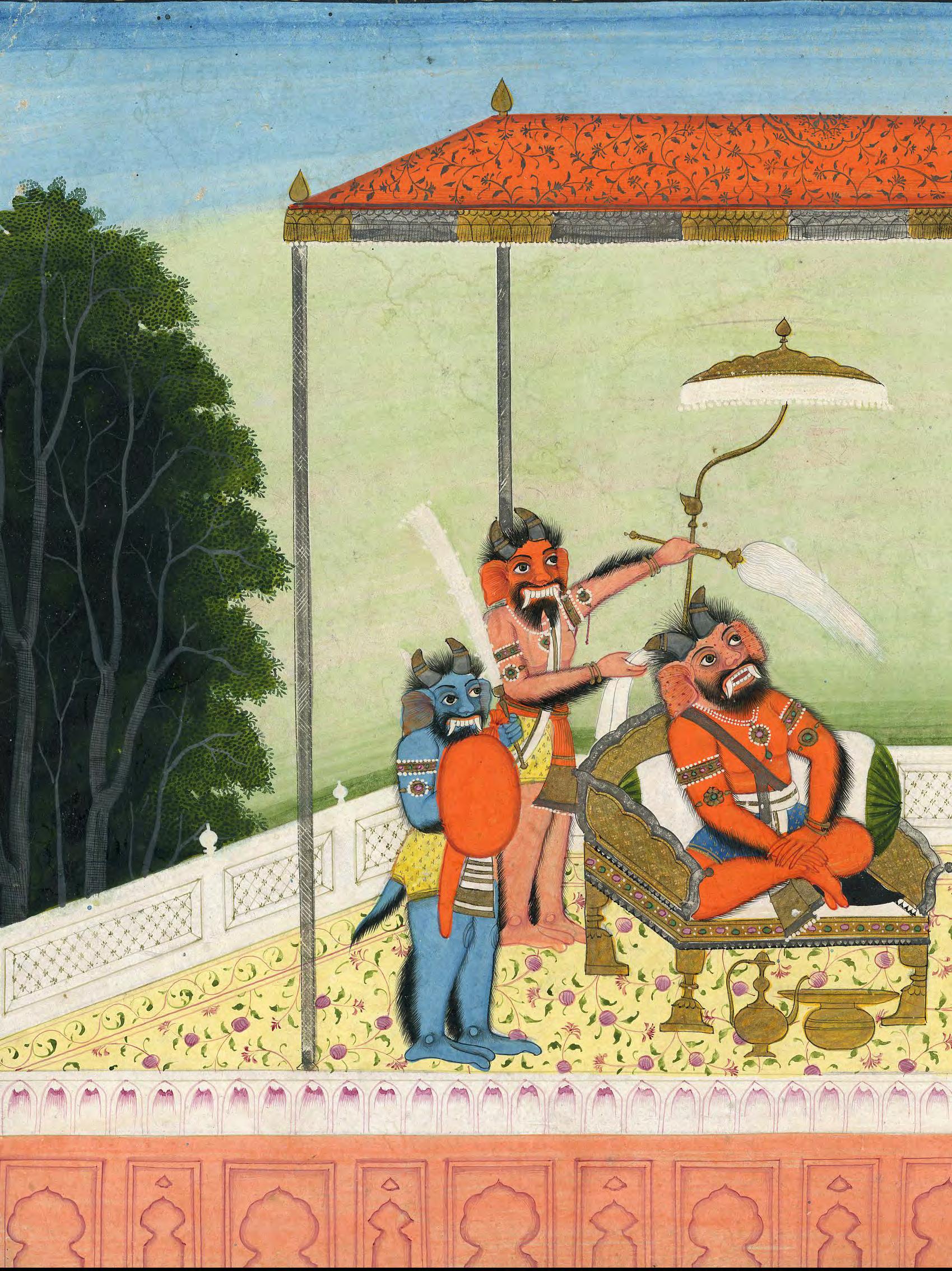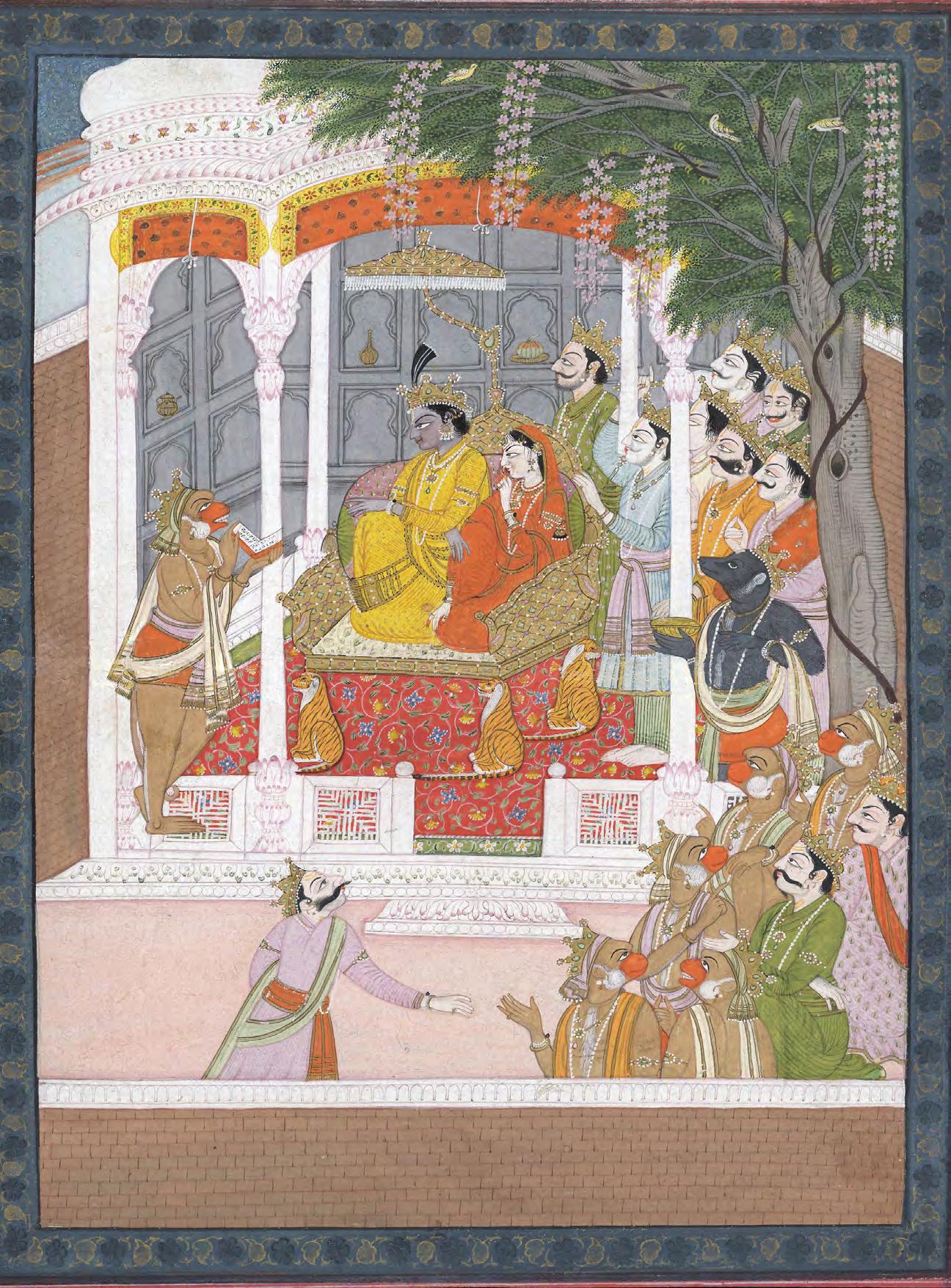 This scene illustrates the Ramayana’s joyful culmination with Rama; the seventh incarnation of Vishnu, and Sita, upon a golden throne (gadi), supported by tiger-shaped legs within a pavilion. Before the auspicious couple Hanuman he mo ke chie ho h i e m i killi g he