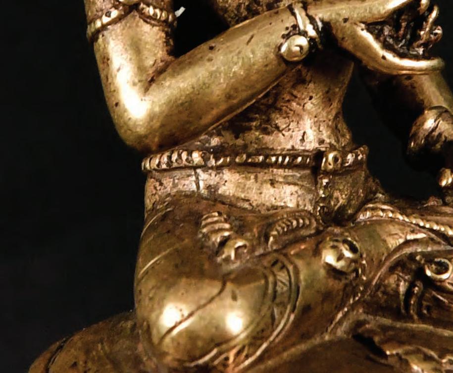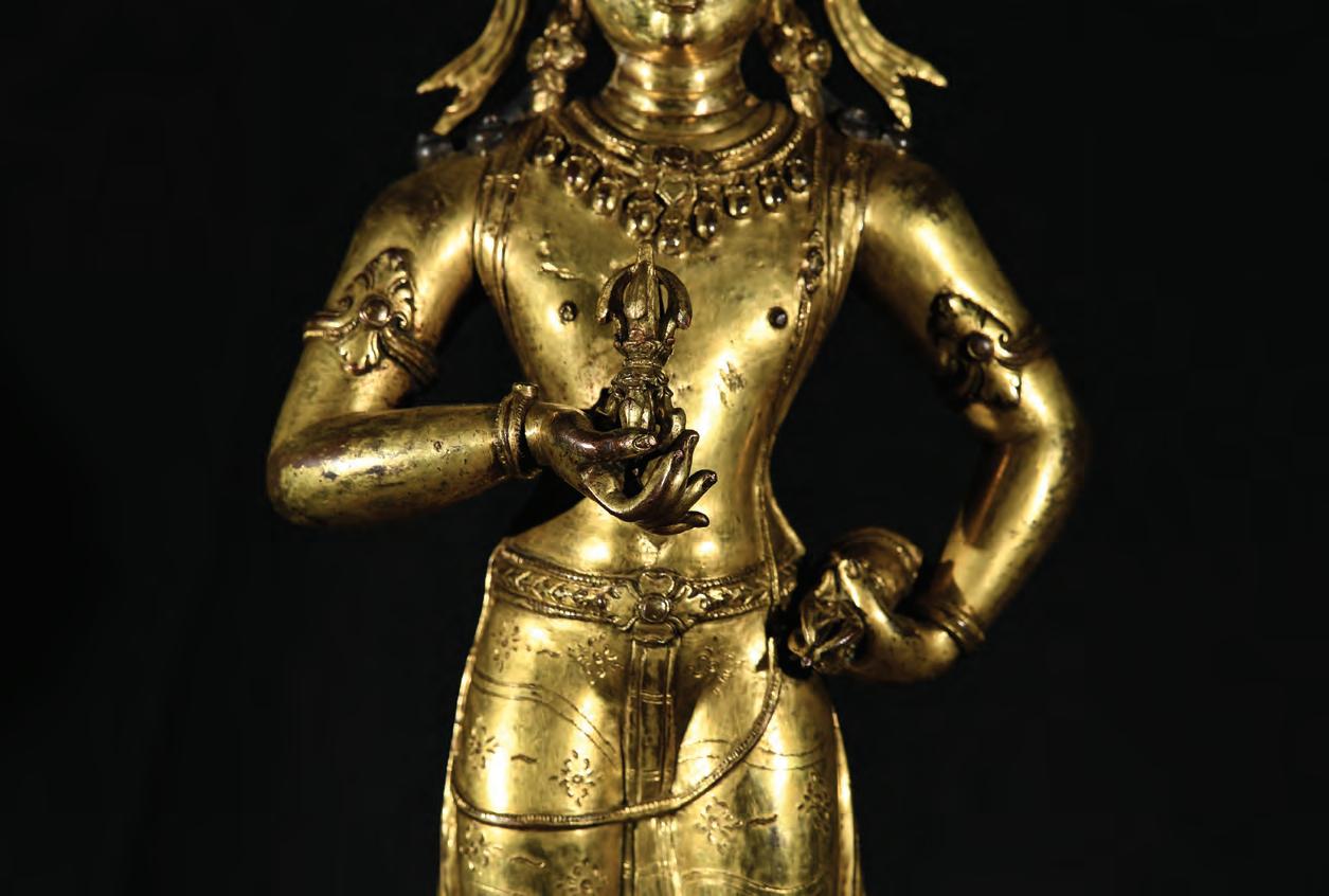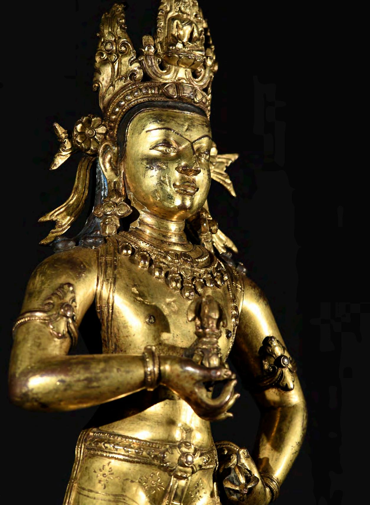 這尊金剛薩埵立像尺寸高大,做工精湛,鎏金飽滿,金色亮目,實屬早期金剛薩埵造像中極為精妙莊嚴的罕見之 作。