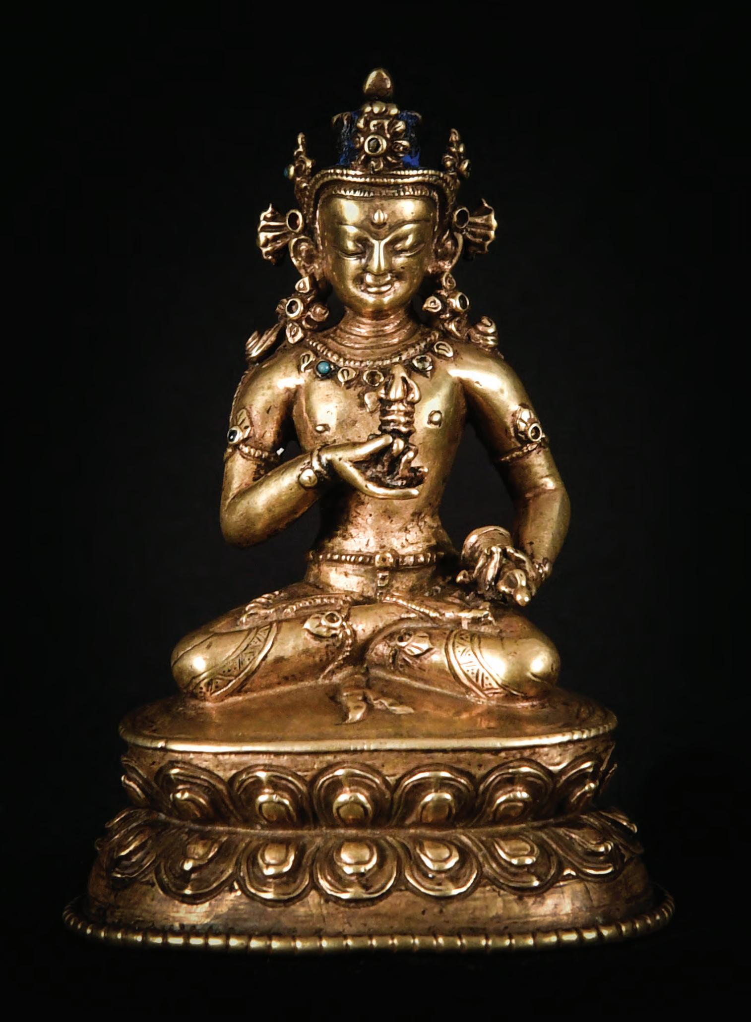 This outstanding large and richly gilded sculpture is a rare early image of Vajrasattva of majestic size and naturalistic detail of the highest quality. The odhisattva is depicted standing tall in a regal poise, adorned in an elaborate crown enclosing an image of Akshobhya, holding a vajra and ghanta. The aristocratic features of his countenance are enhanced by the opulent crown, jewelry and ribbons. Displaying tremendous power and presence, this figure demonstrates the marriage of Pala stylistic elements and the Tibetan sculptural tradition.