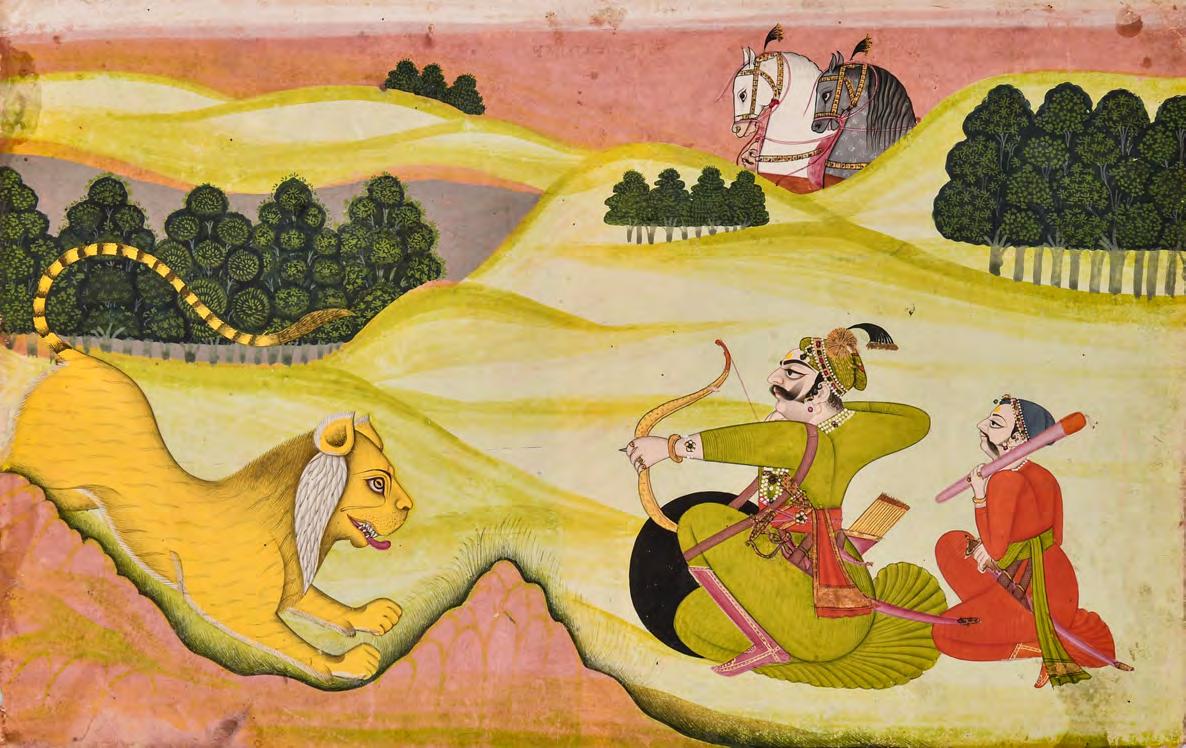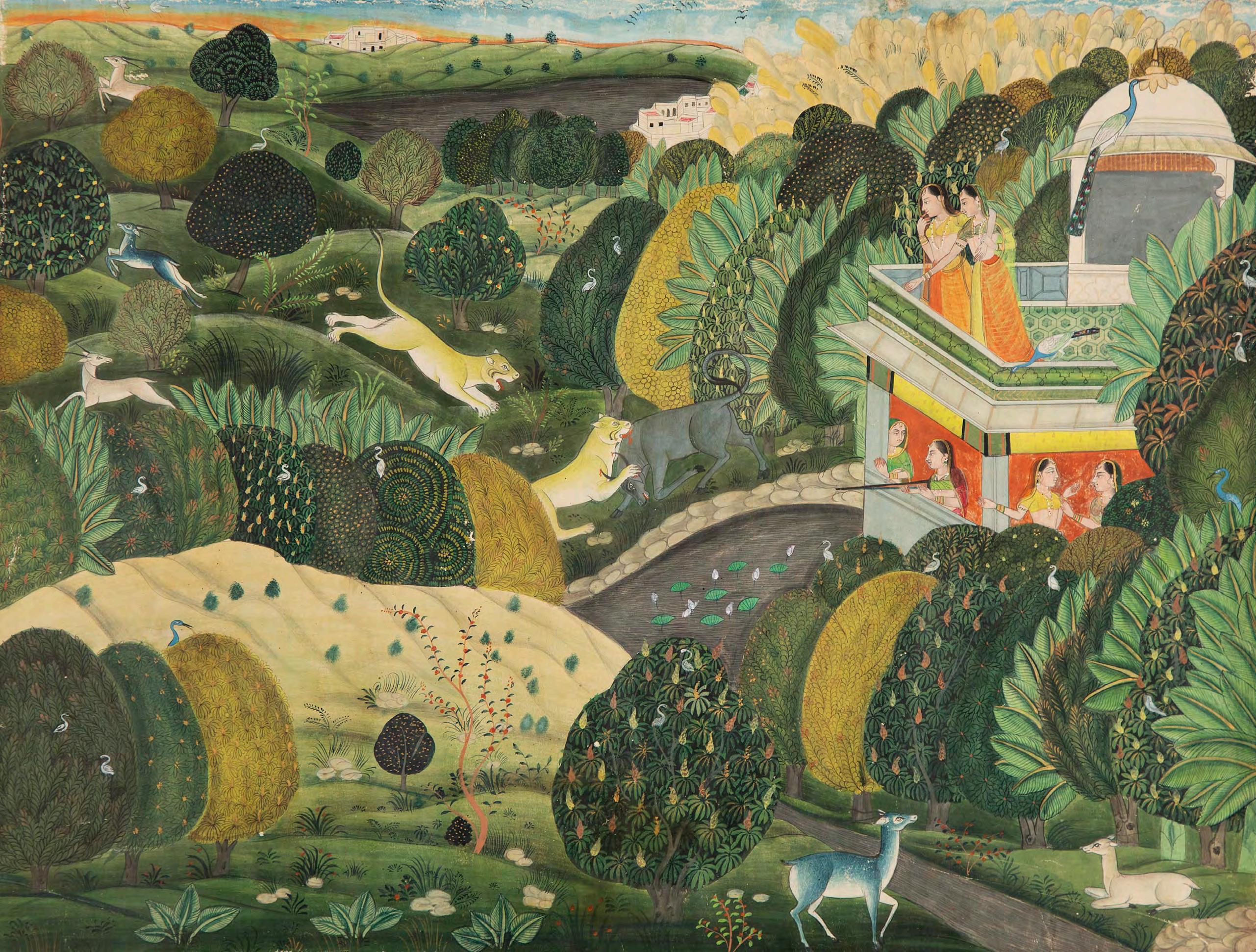 Six women stand on the inside of a Shikaragah (hunting tower), surrounded by lush, vibrant vegetation and an array of different animals. One woman holds a gun on the ground floor, aiming at the ox that has apparently just been overtaken by a pair of lions, two embracing ladies on the terrace viewing the attack in suspense. Hunting scenes were hugely venerated in painting through commissions from the Maharaos, a subject of great royal interest as the hunt was perceived to e a sport for nobility. Kotah was so ell known for its forests that were bursting with lions and tigers that a hunt was frequently initiated to entertain visiting dignitaries like Mughal princes or British officers.